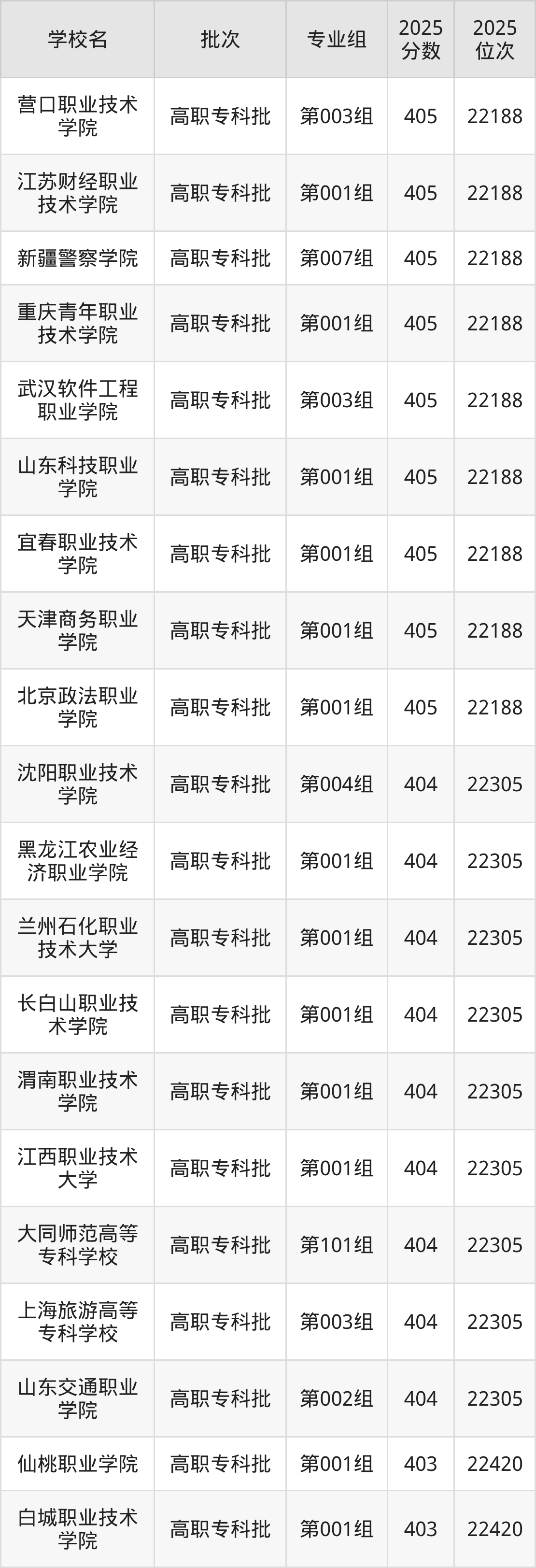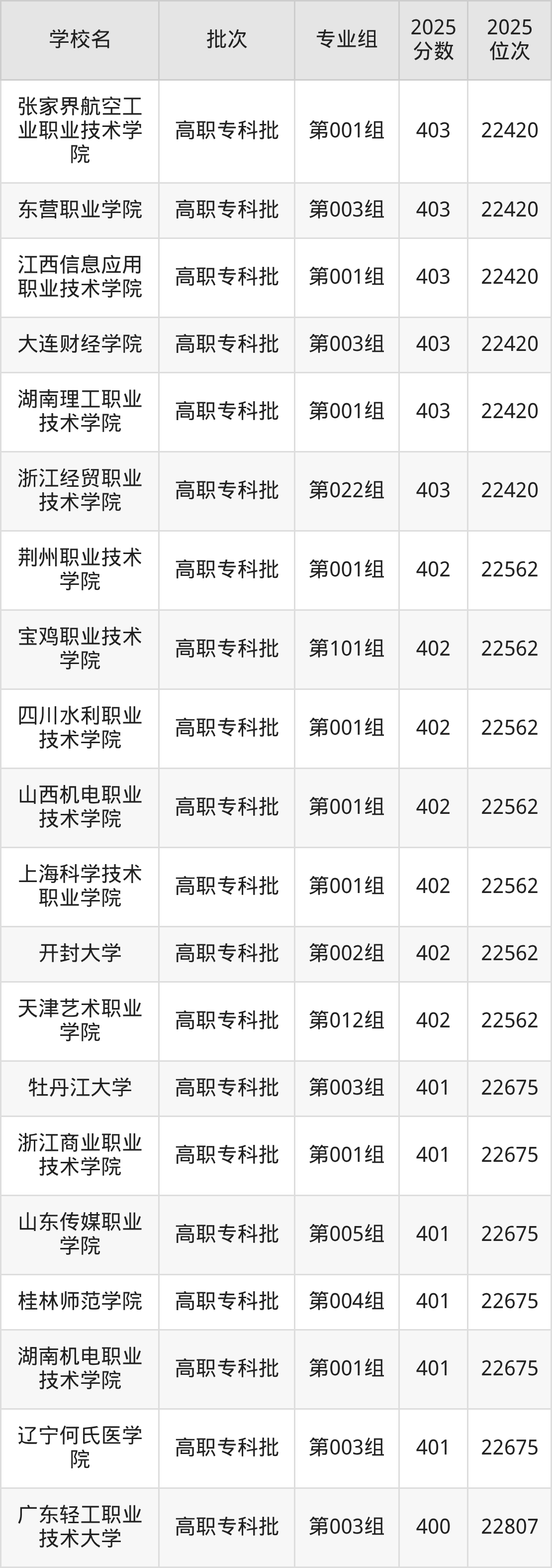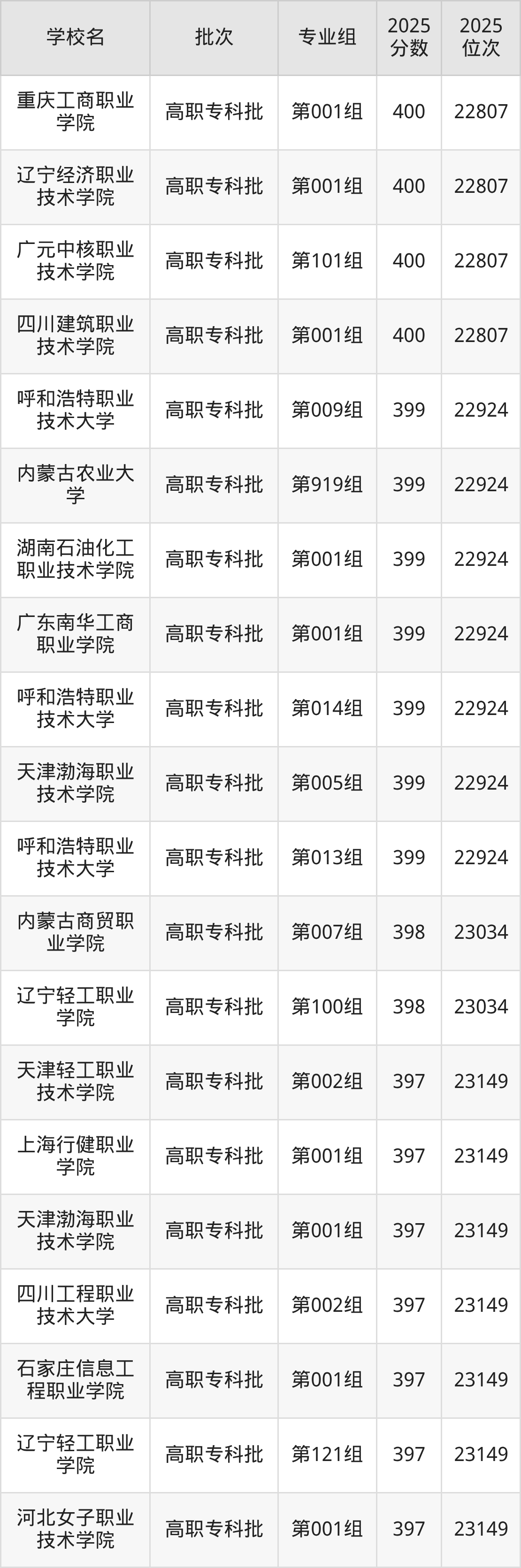 2025年内蒙古高考历史类400分(22676名~22807名)能上的大学有重庆工商职业学院第001组、广元中核职业技术学院第101组、辽宁经济职业技术学院第001组、广东轻工职业技术大学第003组等。