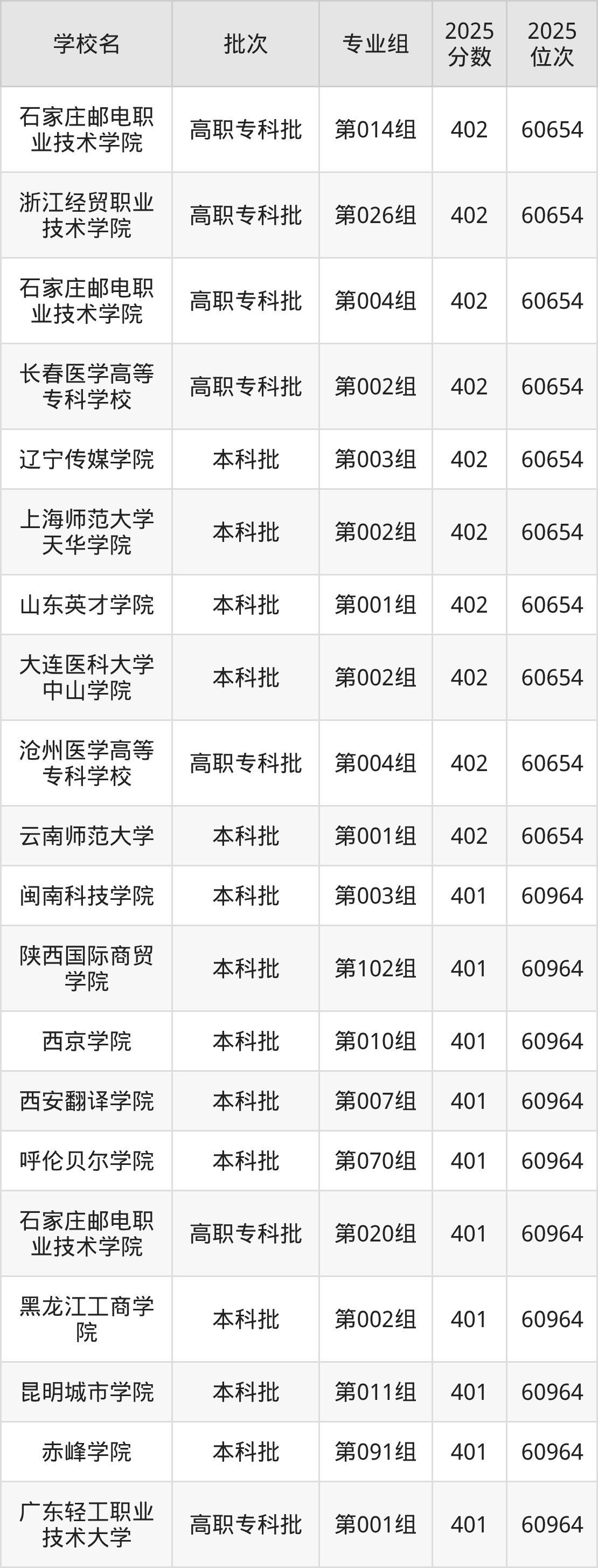另外录取位次低于该区间(较稳妥)的有闽南科技学院第002组(61601名)、兴安职业技术大学第303组(61601名)等;录取位次高于该区间(可冲)的有呼伦贝尔学院第070组(60964名)、广东轻工职业技术大学第001组(60964名)等。