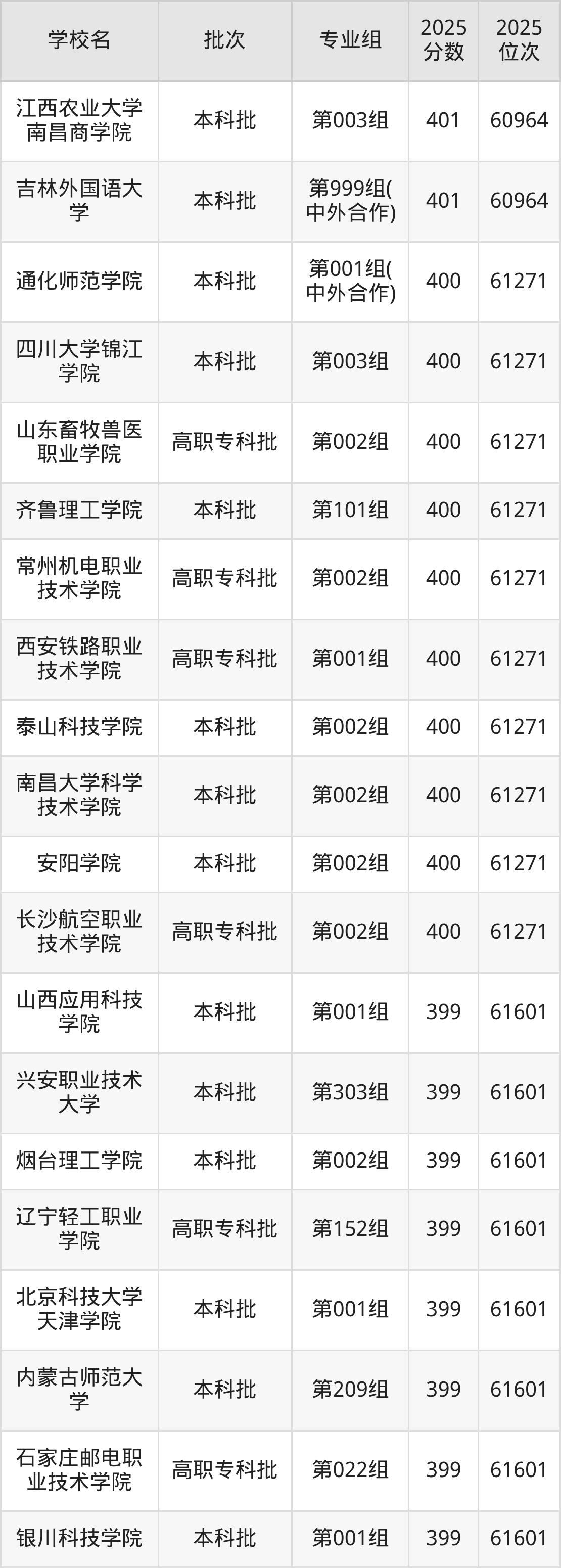 2025年内蒙古高考物理类400分(60965名~61271名)能上的大学有泰山科技学院第002组、常州机电职业技术学院第002组、西安铁路职业技术学院第001组、四川大学锦江学院第003组等。
