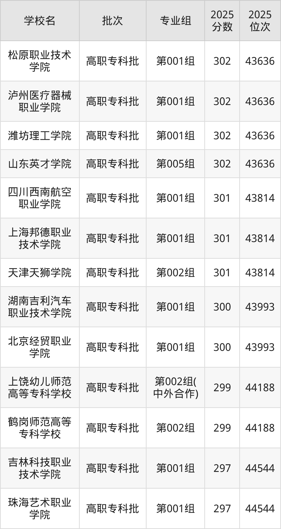 另外录取位次低于该区间(较稳妥)的有吉林科技职业技术学院第001组(44544名)、珠海艺术职业学院第001组(44544名)等;录取位次高于该区间(可冲)的有北京经贸职业学院第001组(43993名)、湖南吉利汽车职业技术学院第001组(43993名)等。