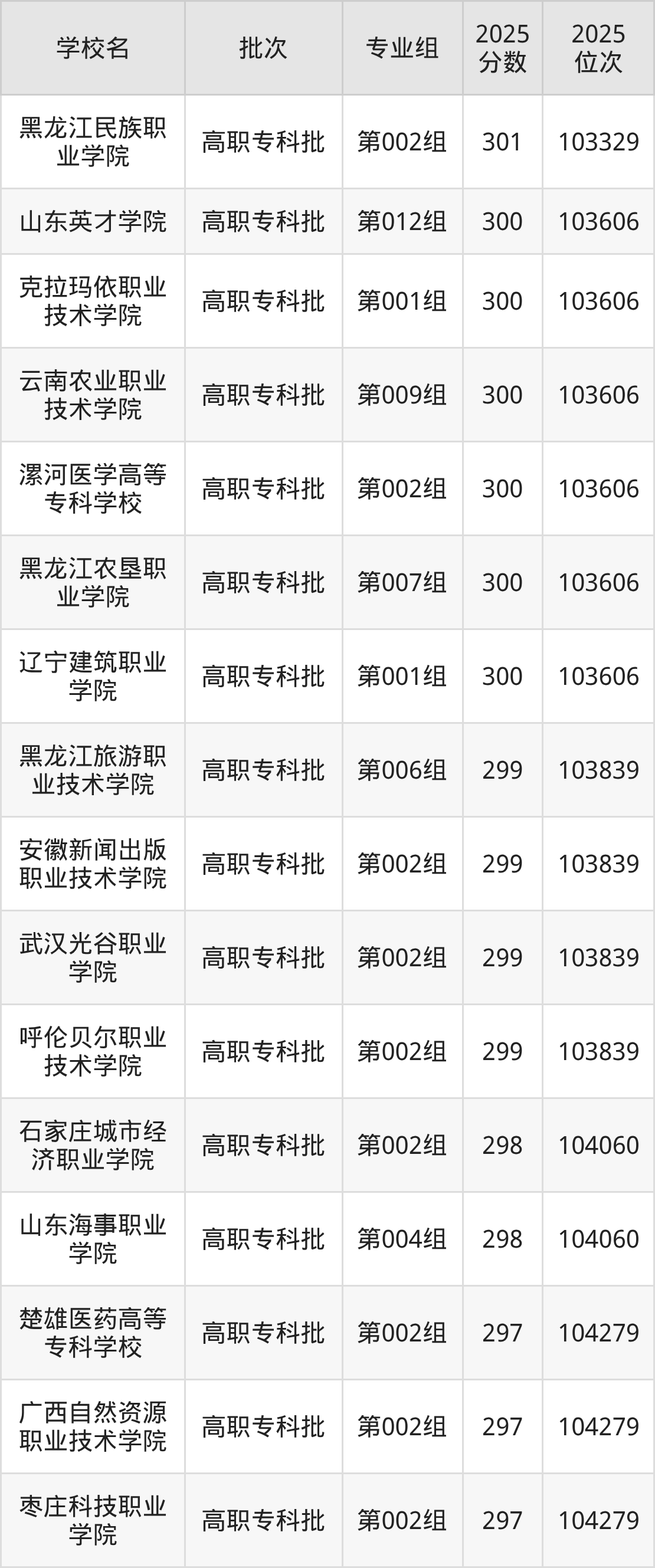 2025年黑龙江高考物理类299分(103607名~103839名)能上的大学有呼伦贝尔职业技术学院第002组、黑龙江旅游职业技术学院第006组、安徽新闻出版职业技术学院第002组、武汉光谷职业学院第002组。