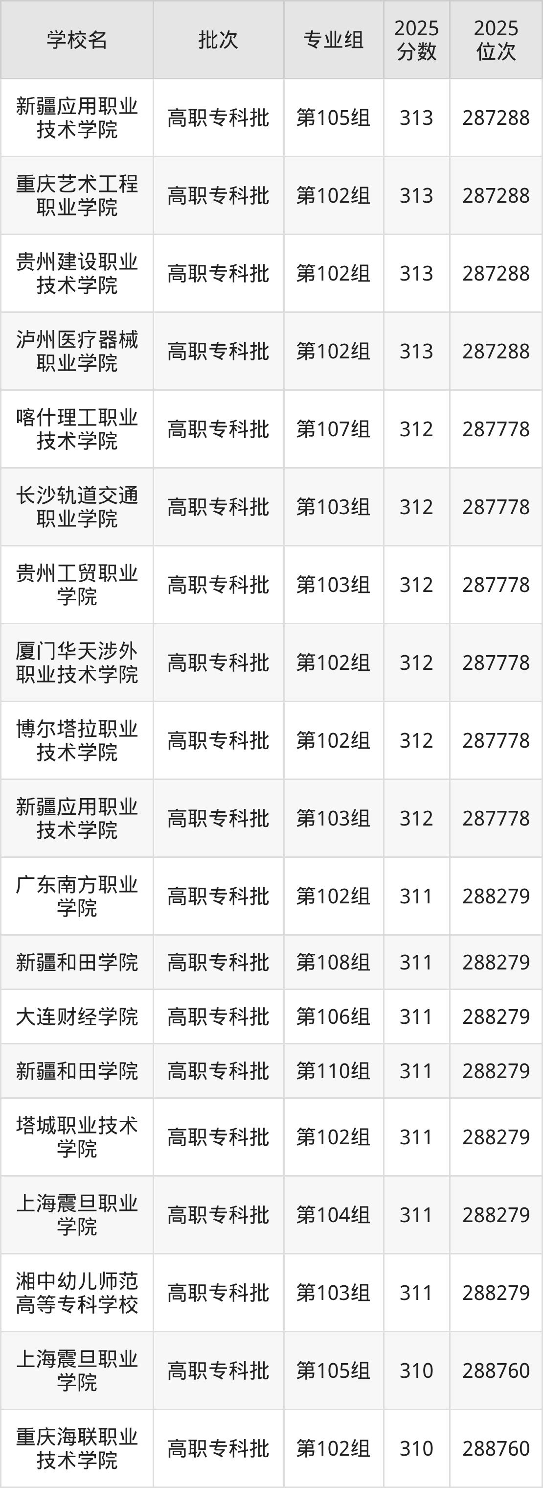 另外录取位次低于该区间(较稳妥)的有上海震旦职业学院第105组(288760名)、重庆海联职业技术学院第102组(288760名)等;录取位次高于该区间(可冲)的有厦门华天涉外职业技术学院第102组(287778名)、长沙轨道交通职业学院第103组(287778名)等。