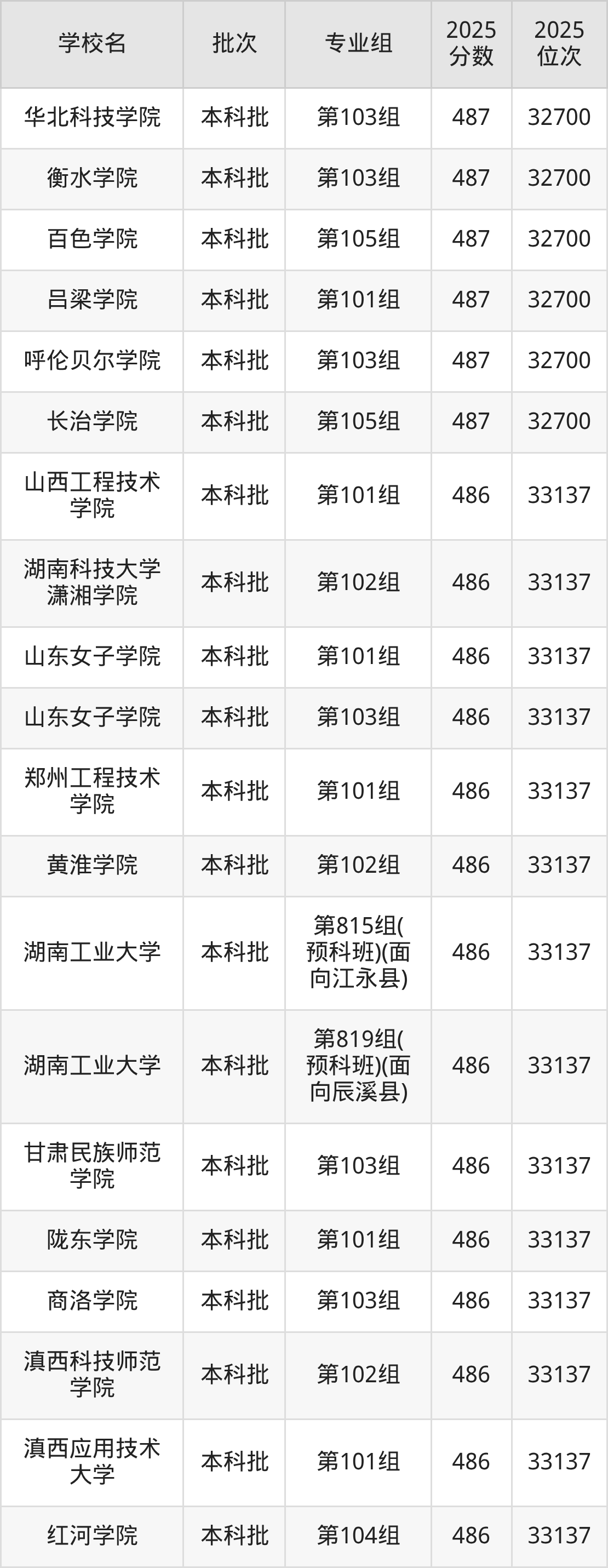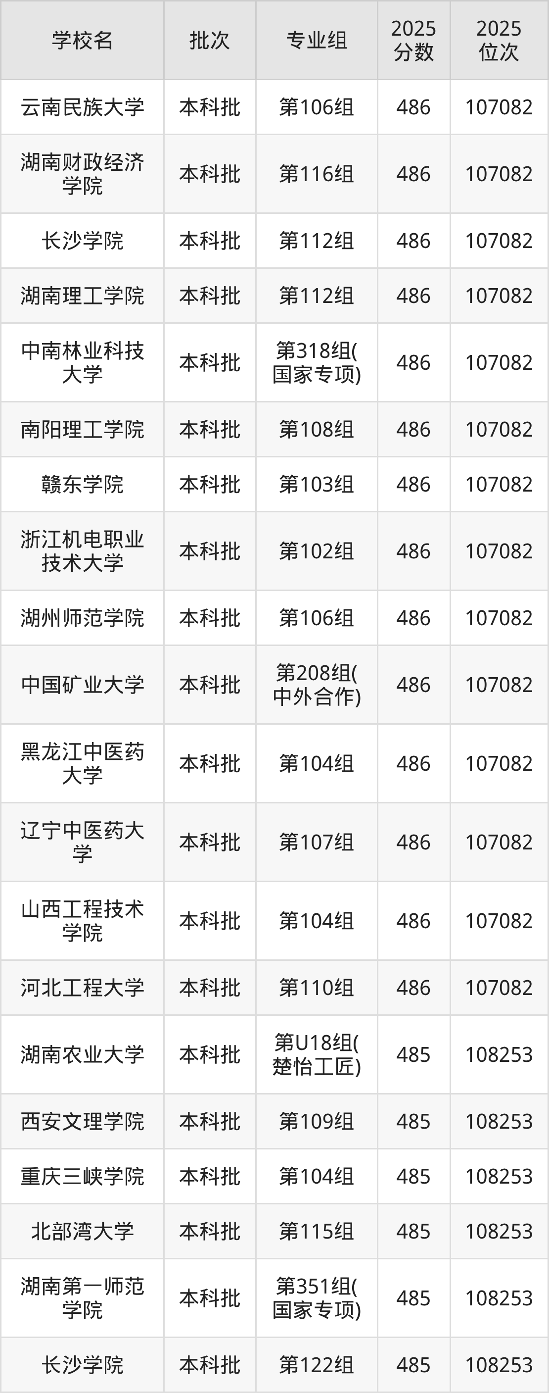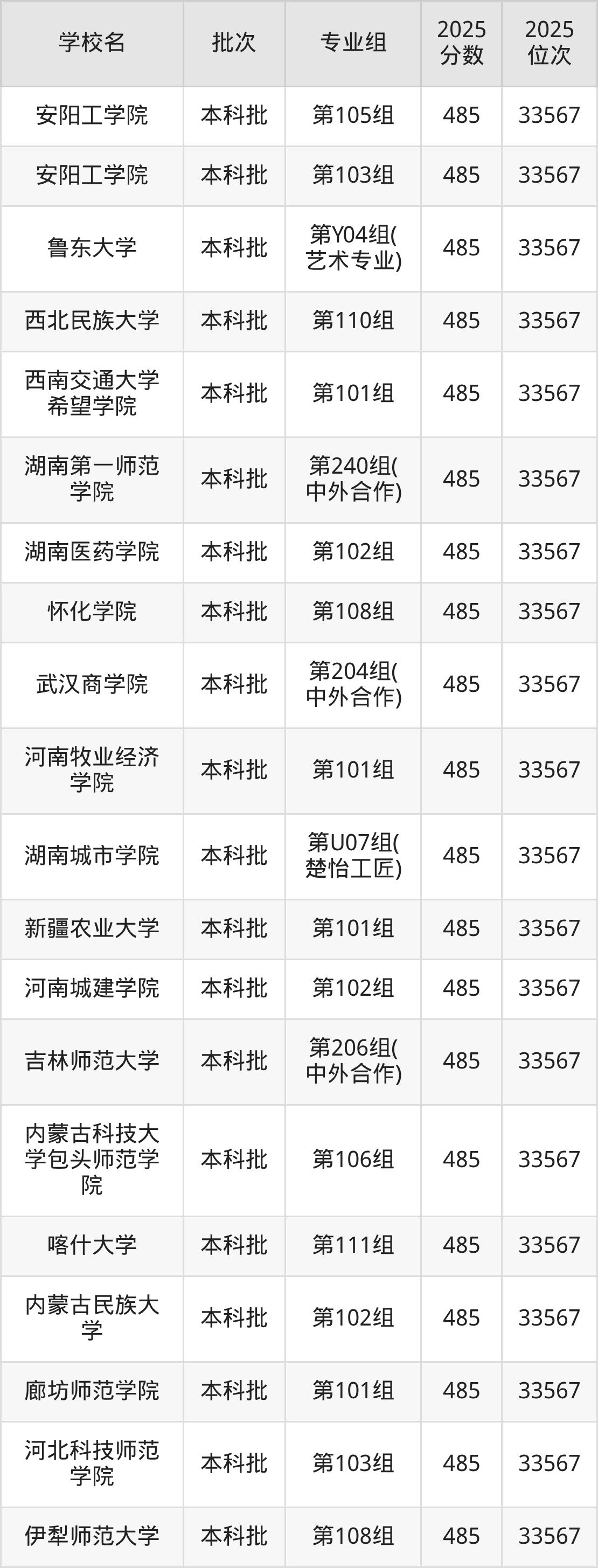 2025年湖南高考历史类485分(33138名~33567名)能上的大学有河北科技师范学院第103组、廊坊师范学院第101组、内蒙古民族大学第102组、内蒙古科技大学包头师范学院第106组等。