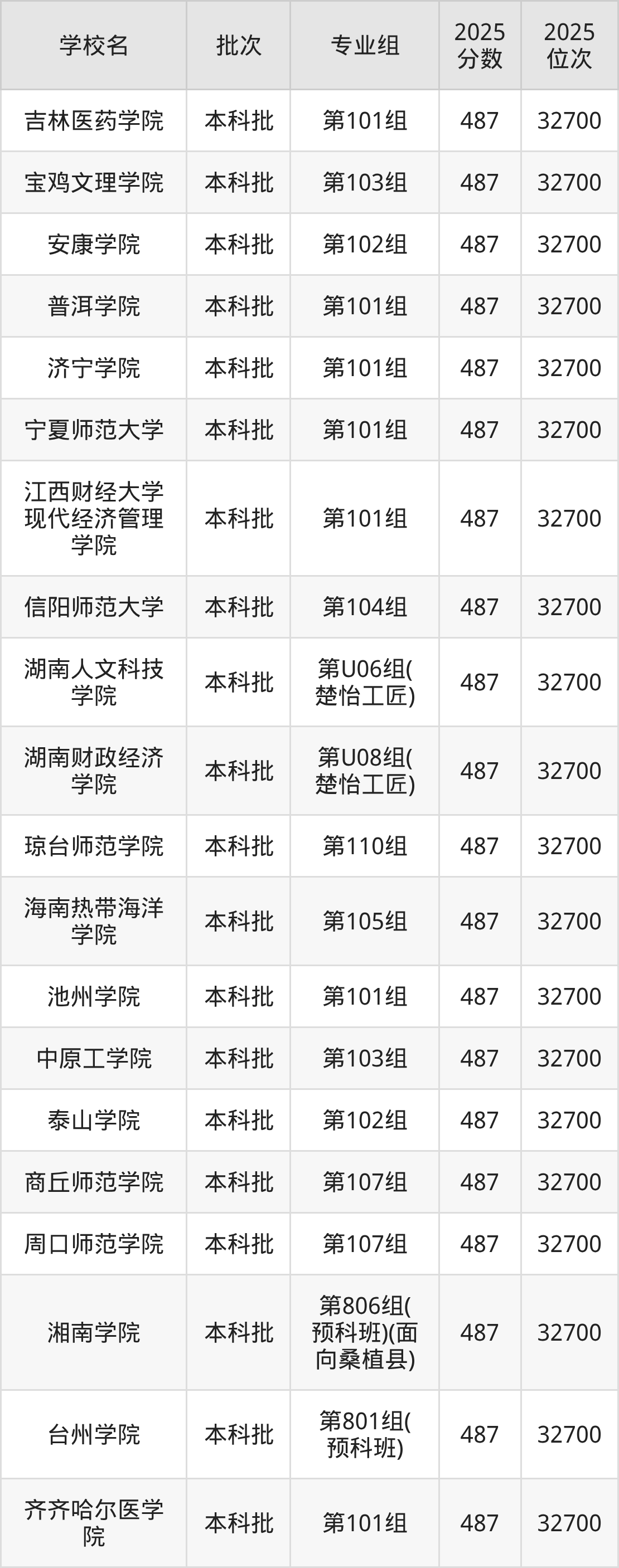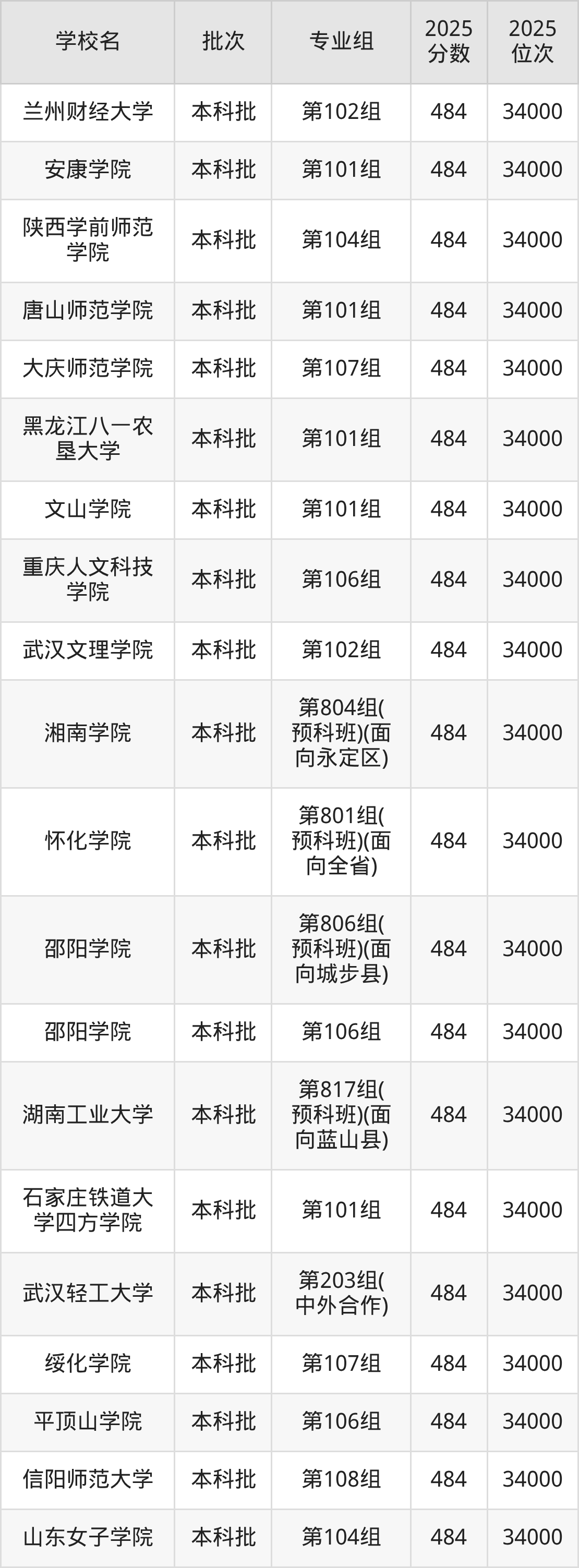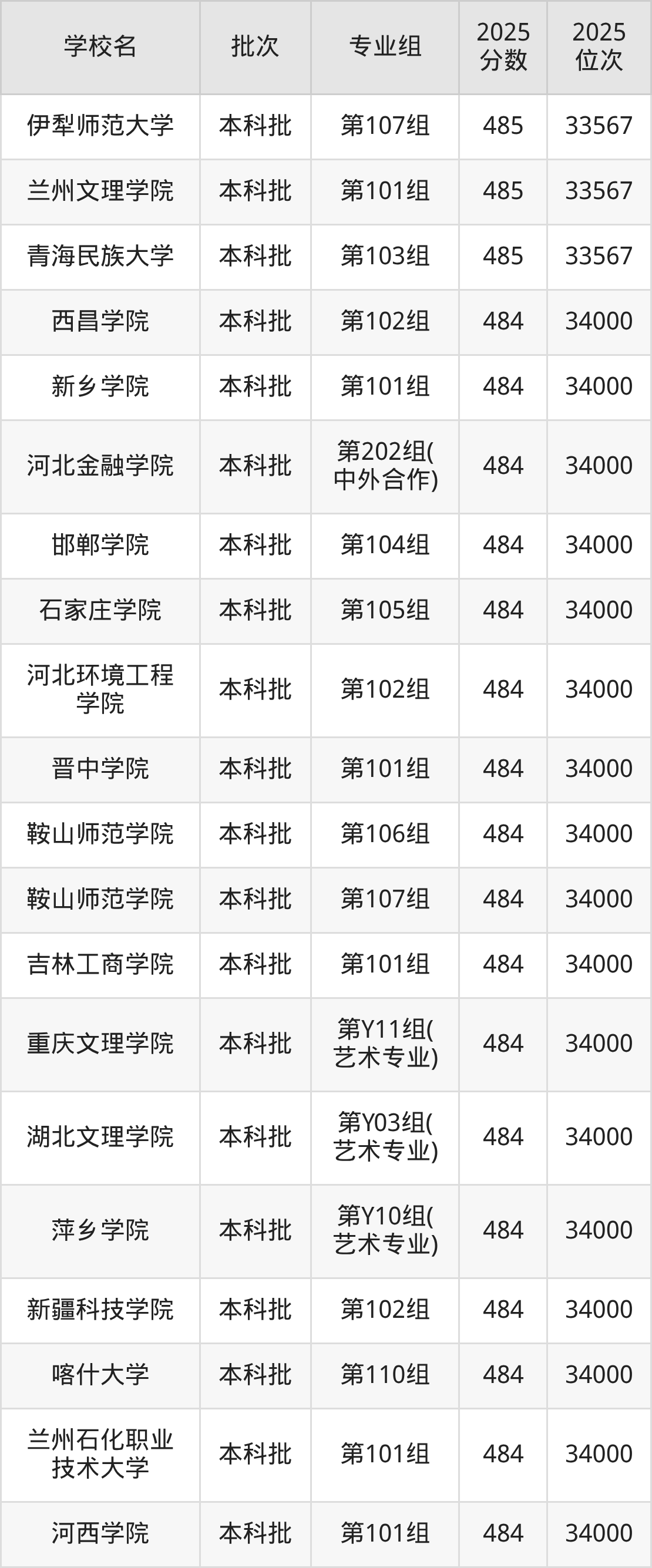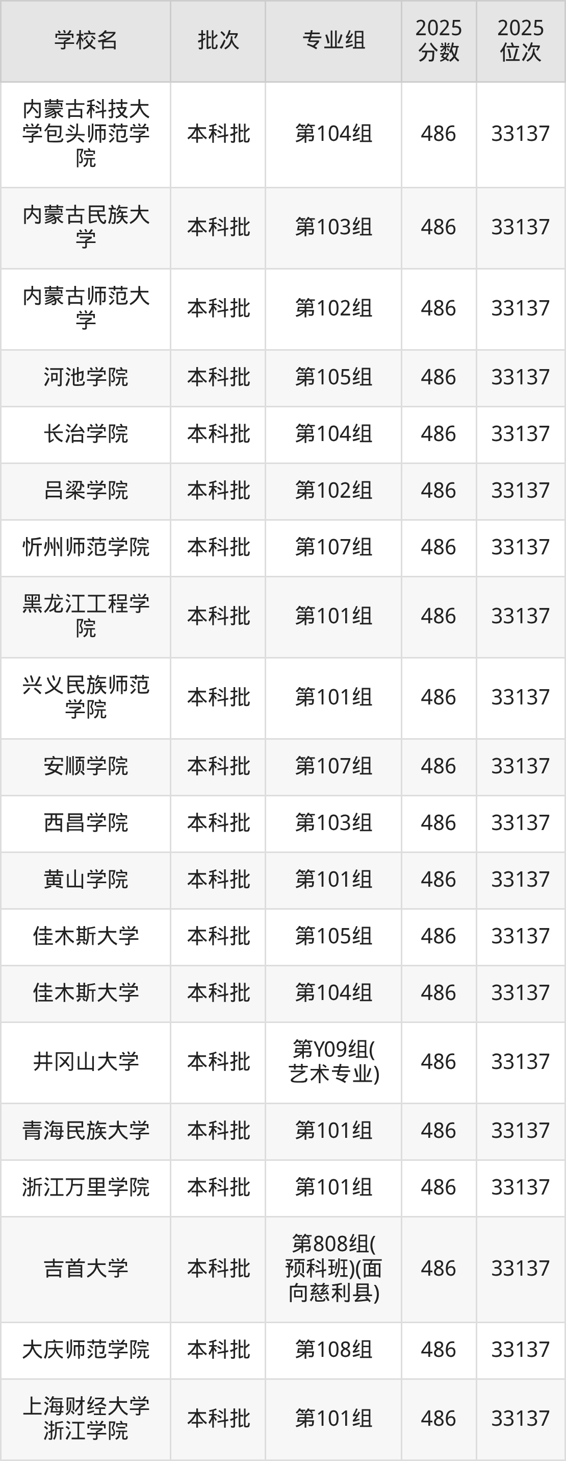 2025年湖南高考历史类485分(33138名~33567名)能上的大学有河北科技师范学院第103组、廊坊师范学院第101组、内蒙古民族大学第102组、内蒙古科技大学包头师范学院第106组等。