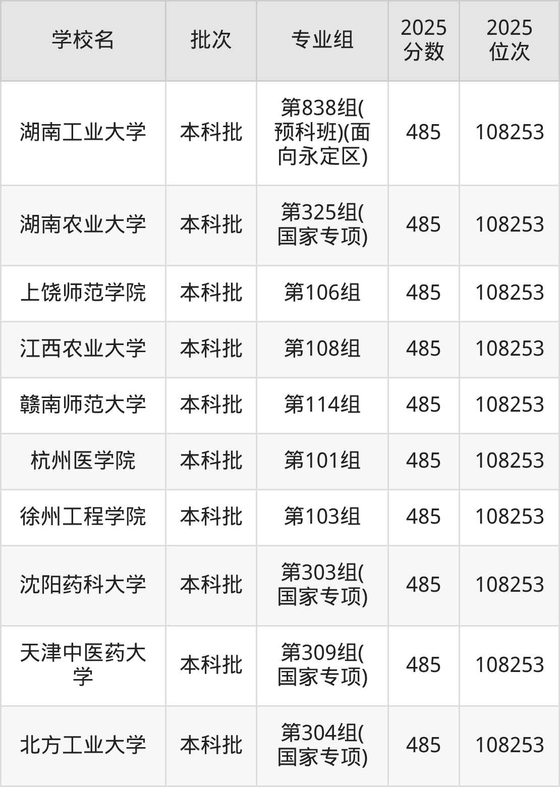 2025年湖南高考物理类485分(107083名~108253名)能上的大学有北方工业大学第304组(国家专项)、天津中医药大学第309组(国家专项)、沈阳药科大学第303组(国家专项)、徐州工程学院第103组等。