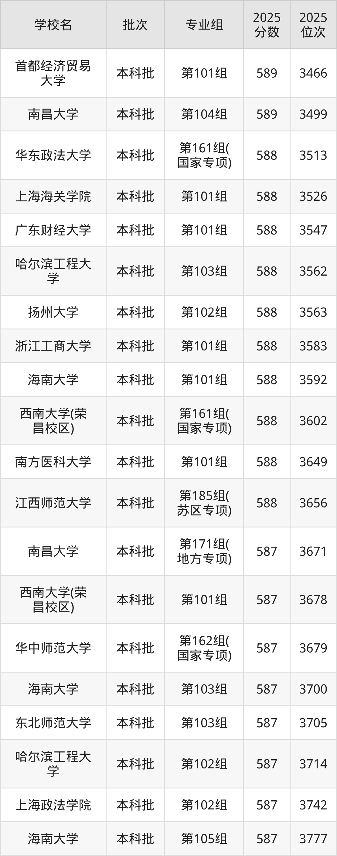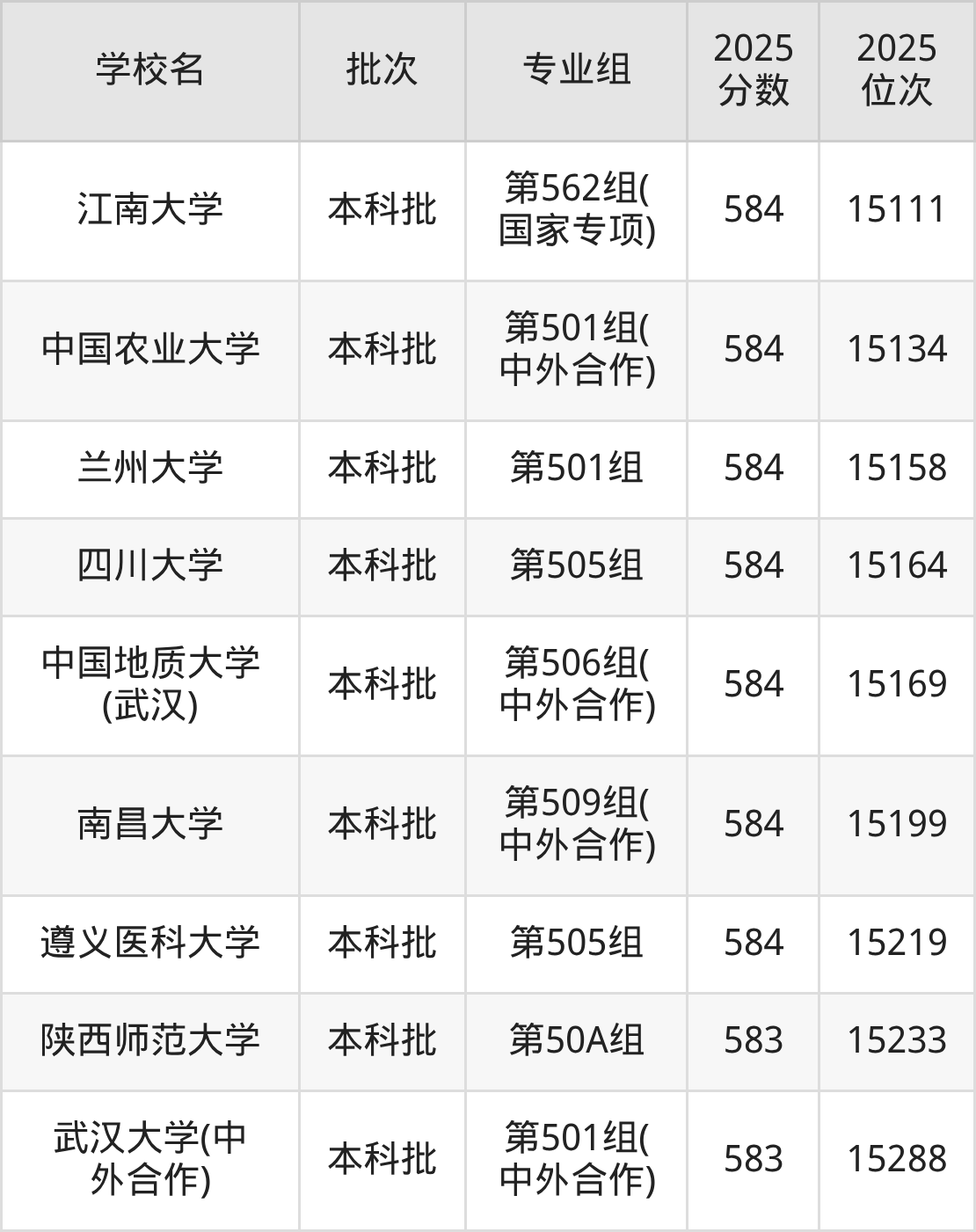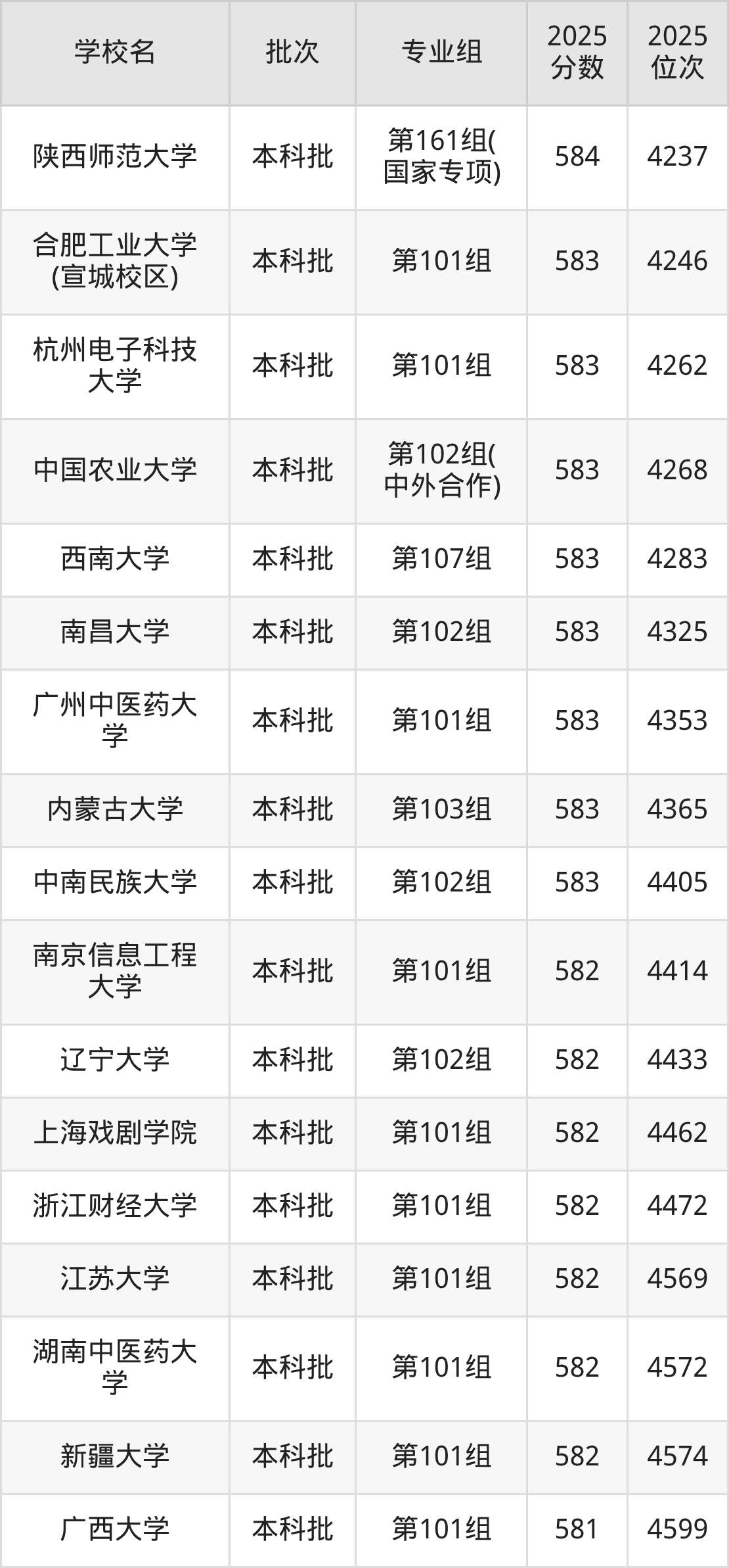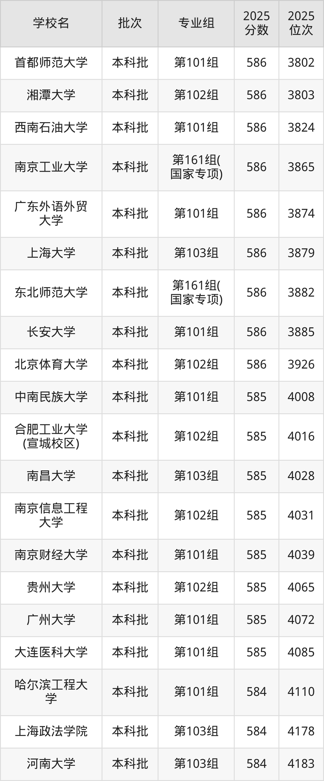 2025年江西高考历史类585分(3953名~4103名)能上的大学有南京信息工程大学第102组、合肥工业大学(宣城校区)第102组、贵州大学第102组、大连医科大学第101组等。