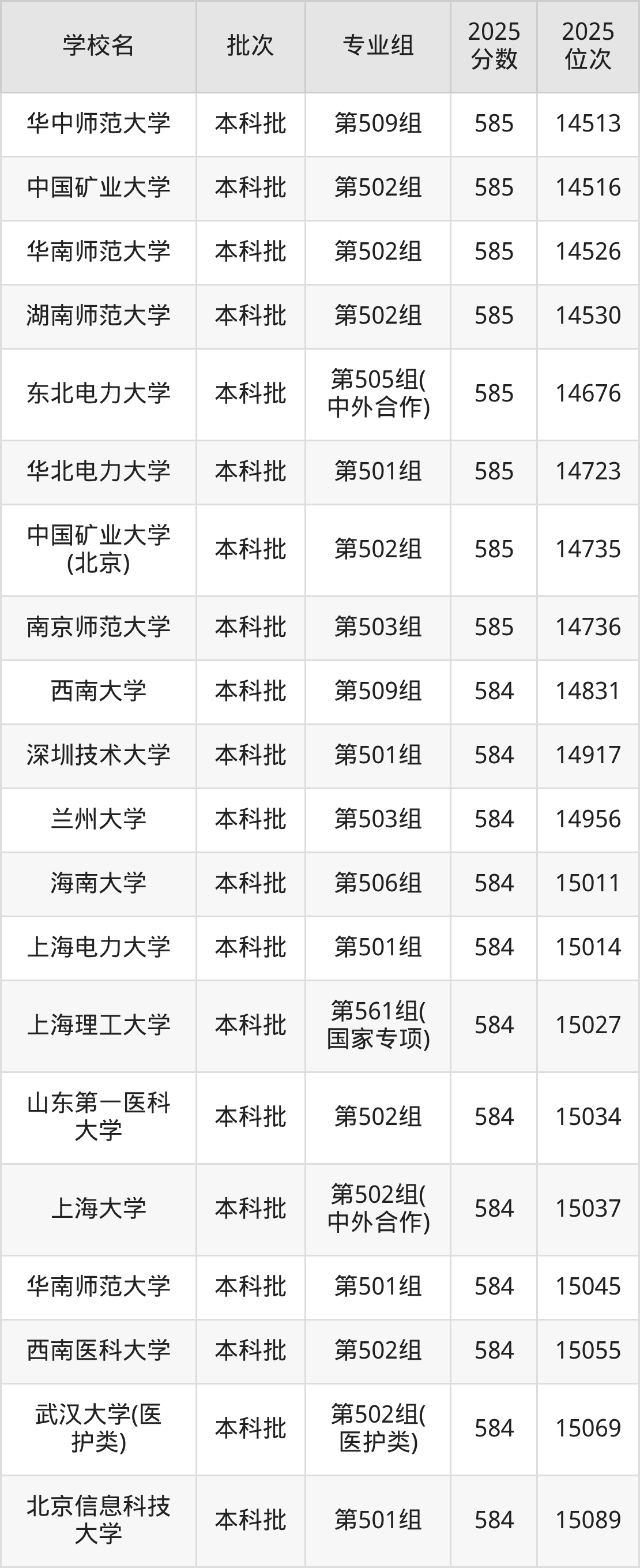 江西高考585分:历史类排名4103位、物理类排名14815位。该分数位次对应能上的大学历史类有南京信息工程大学第102组、合肥工业大学(宣城校区)第102组;物理类有东北师范大学第503组、南京师范大学第503组,更多名单如下文所示,2026届考生可参考。