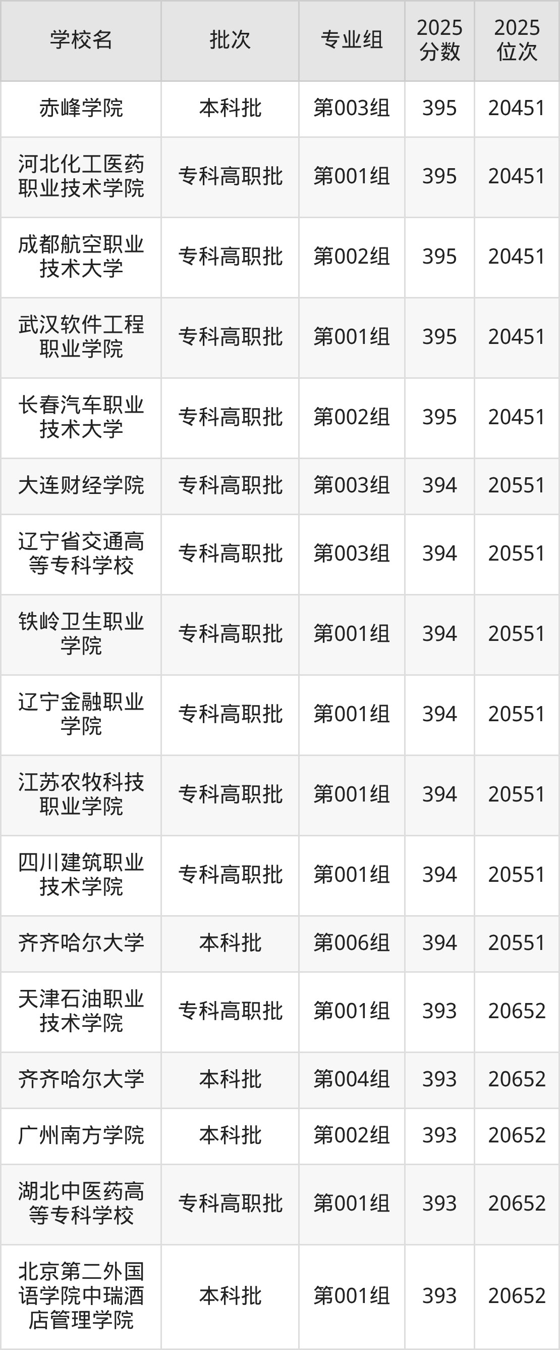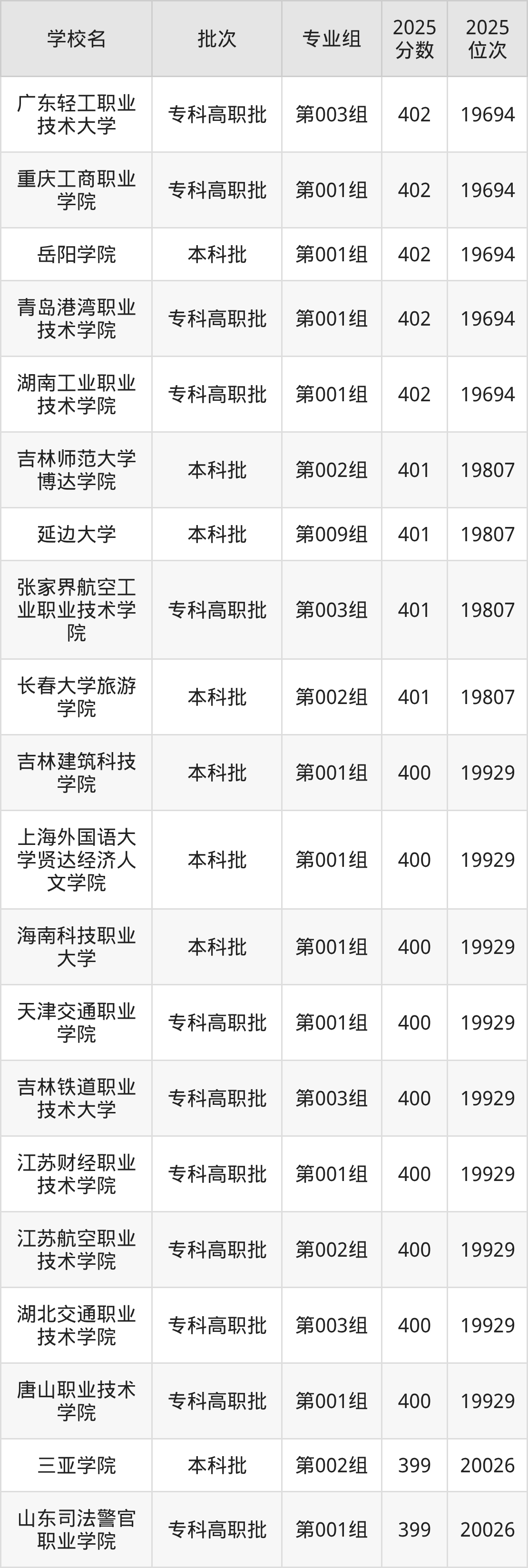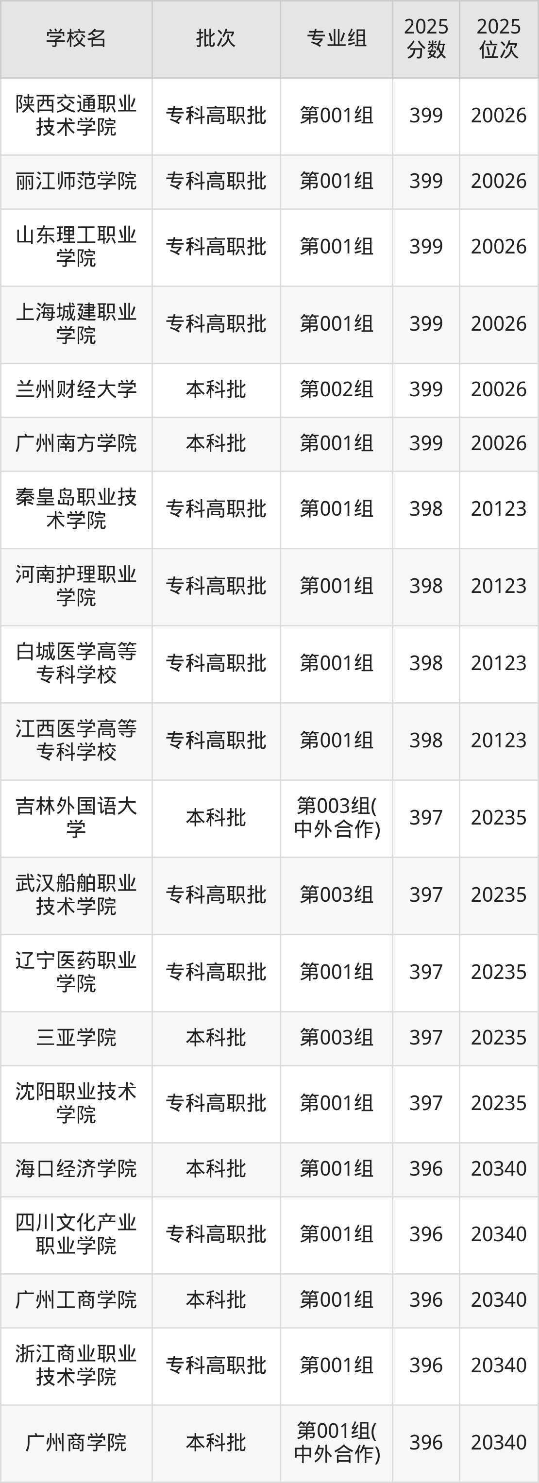 2025年吉林高考历史类397分(20124名~20235名)能上的大学有吉林外国语大学第003组(中外合作)、三亚学院第003组、辽宁医药职业学院第001组、沈阳职业技术学院第001组等。