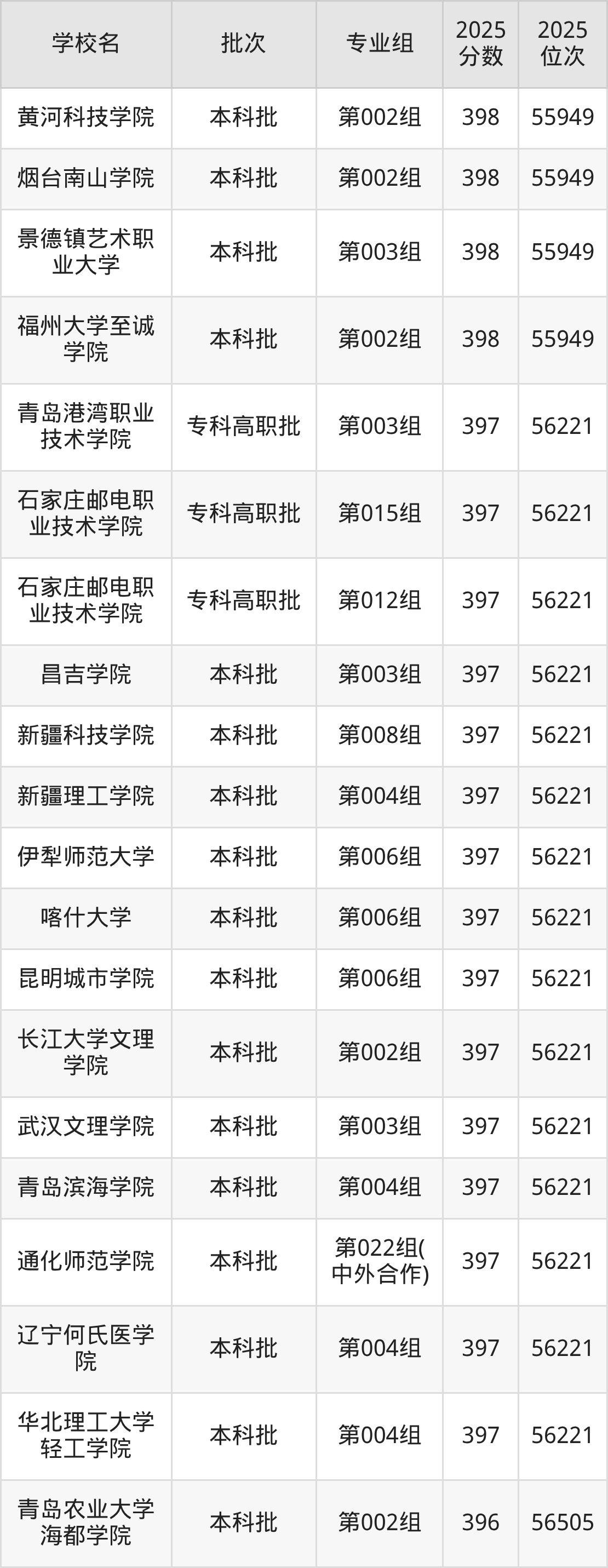 2025年吉林高考物理类397分(55950名~56221名)能上的大学有华北理工大学轻工学院第004组、辽宁何氏医学院第004组、通化师范学院第022组(中外合作)、青岛滨海学院第004组等。