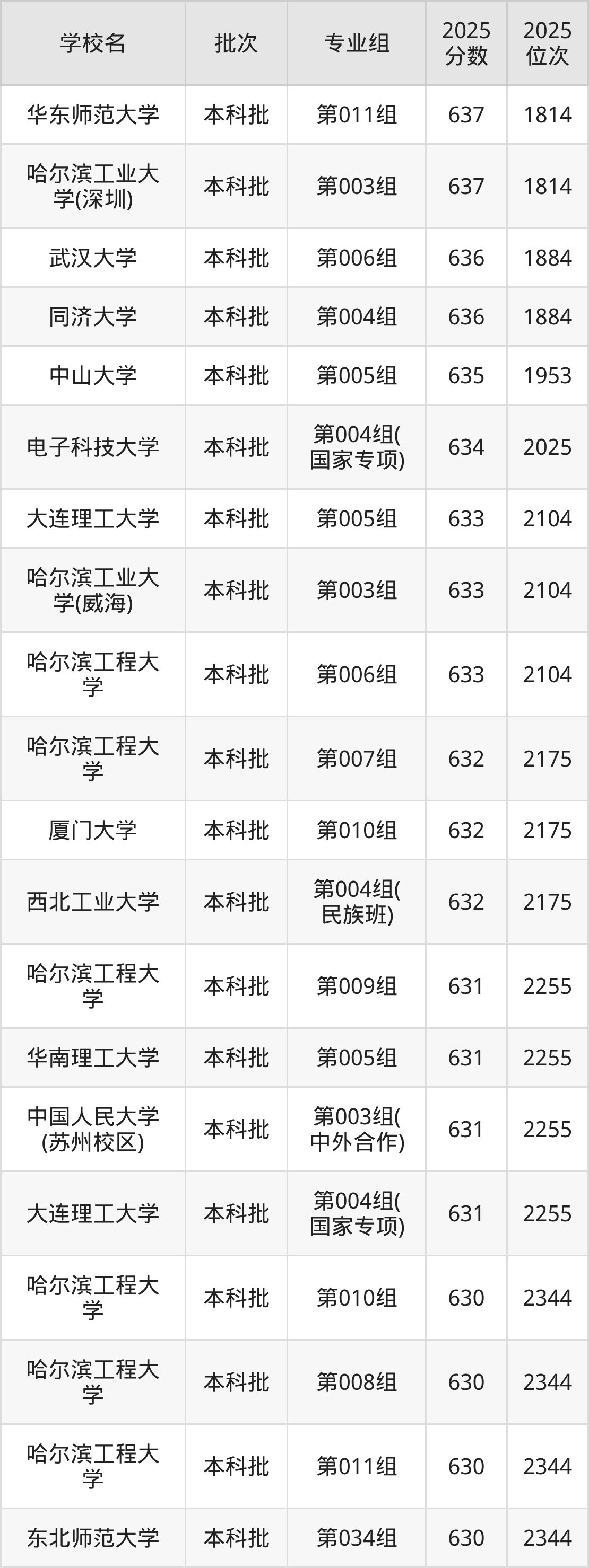 2025年吉林高考物理类630分(2256名~2344名)能上的大学有东北师范大学第034组、哈尔滨工程大学第008组、哈尔滨工程大学第010组、哈尔滨工程大学第011组。