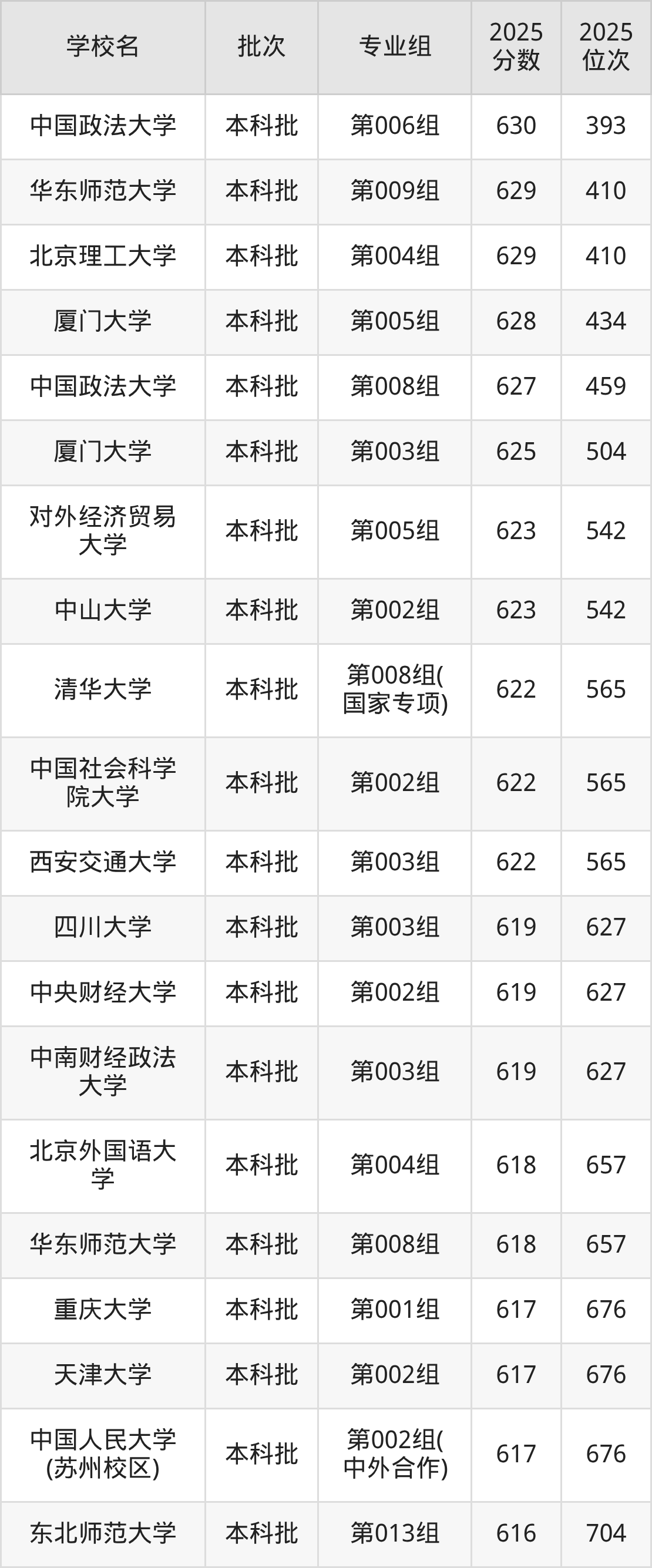 2025年吉林高考历史类630分(368名~393名)能上的大学有中国政法大学第006组、上海财经大学第002组。