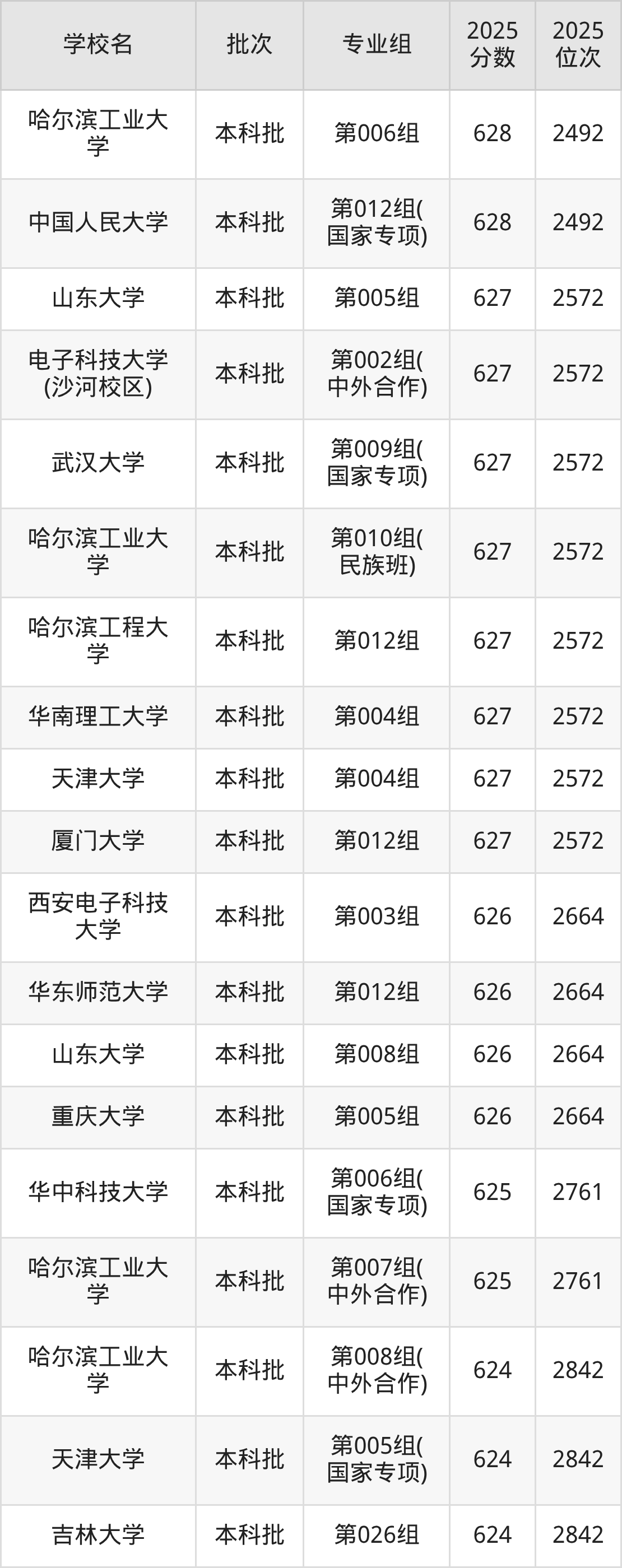 另外录取位次低于该区间(较稳妥)的有哈尔滨工业大学第006组(2492名)、中国人民大学第012组(国家专项)(2492名)等;录取位次高于该区间(可冲)的有大连理工大学第004组(国家专项)(2255名)、哈尔滨工程大学第009组(2255名)等。