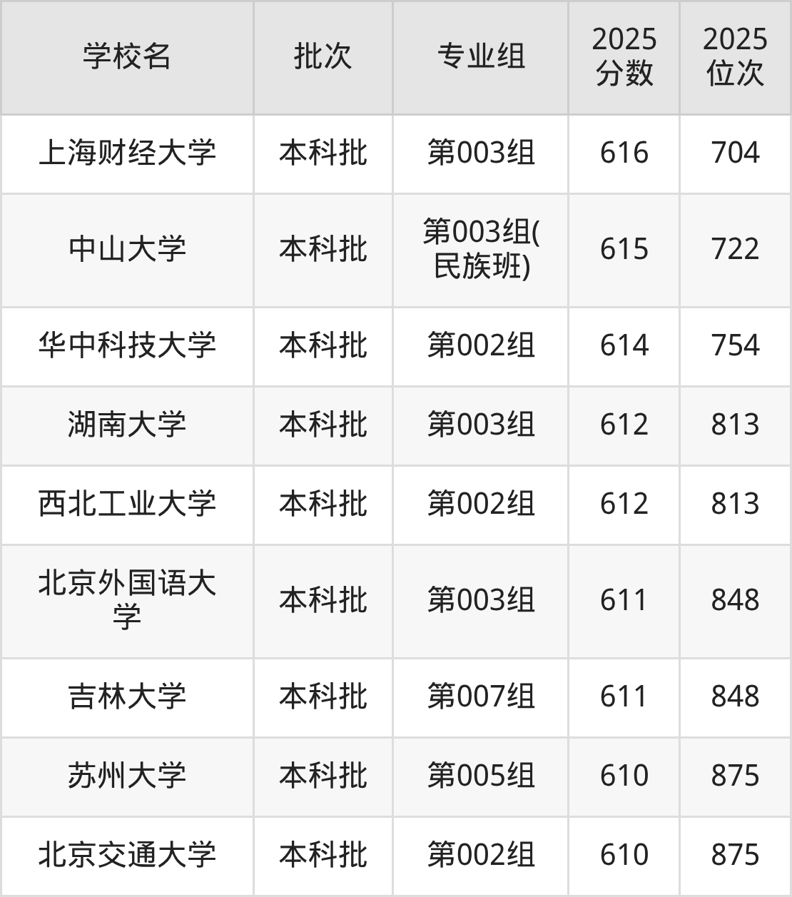 由于高考录取分数线历年波动较大,因此本文以该分数对应的位次排名为大家整理能上的大学名单。