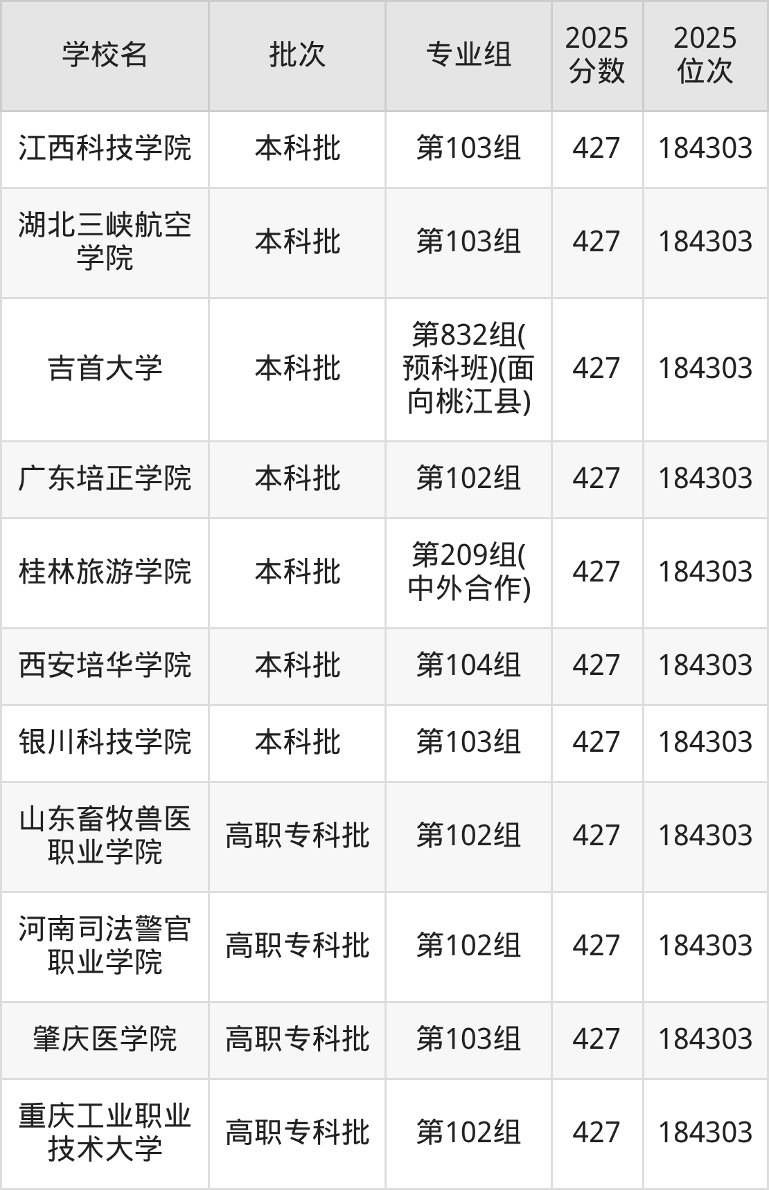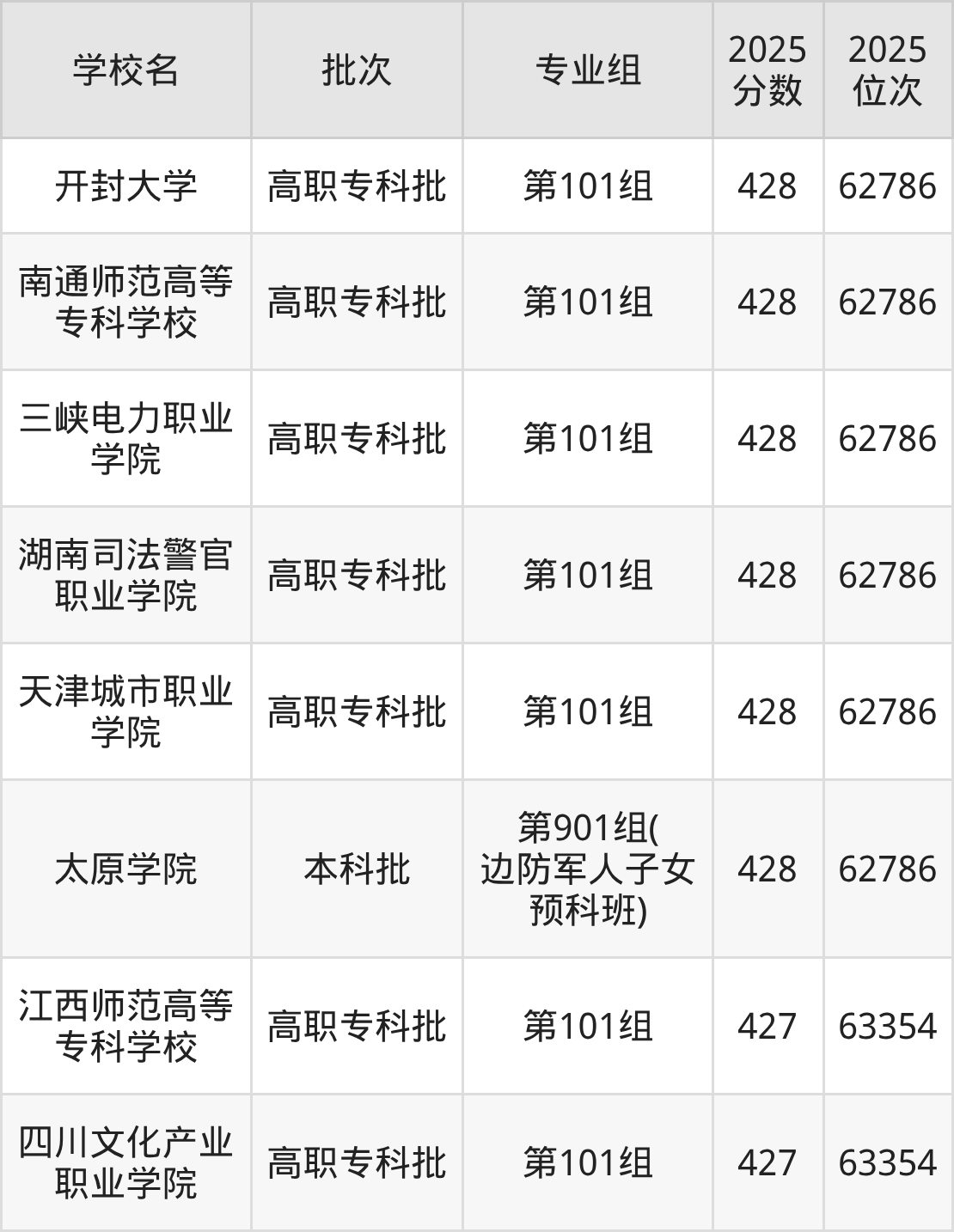 2025年湖南高考历史类427分(62787名~63354名)能上的大学有江西师范高等专科学校第101组、四川文化产业职业学院第101组。