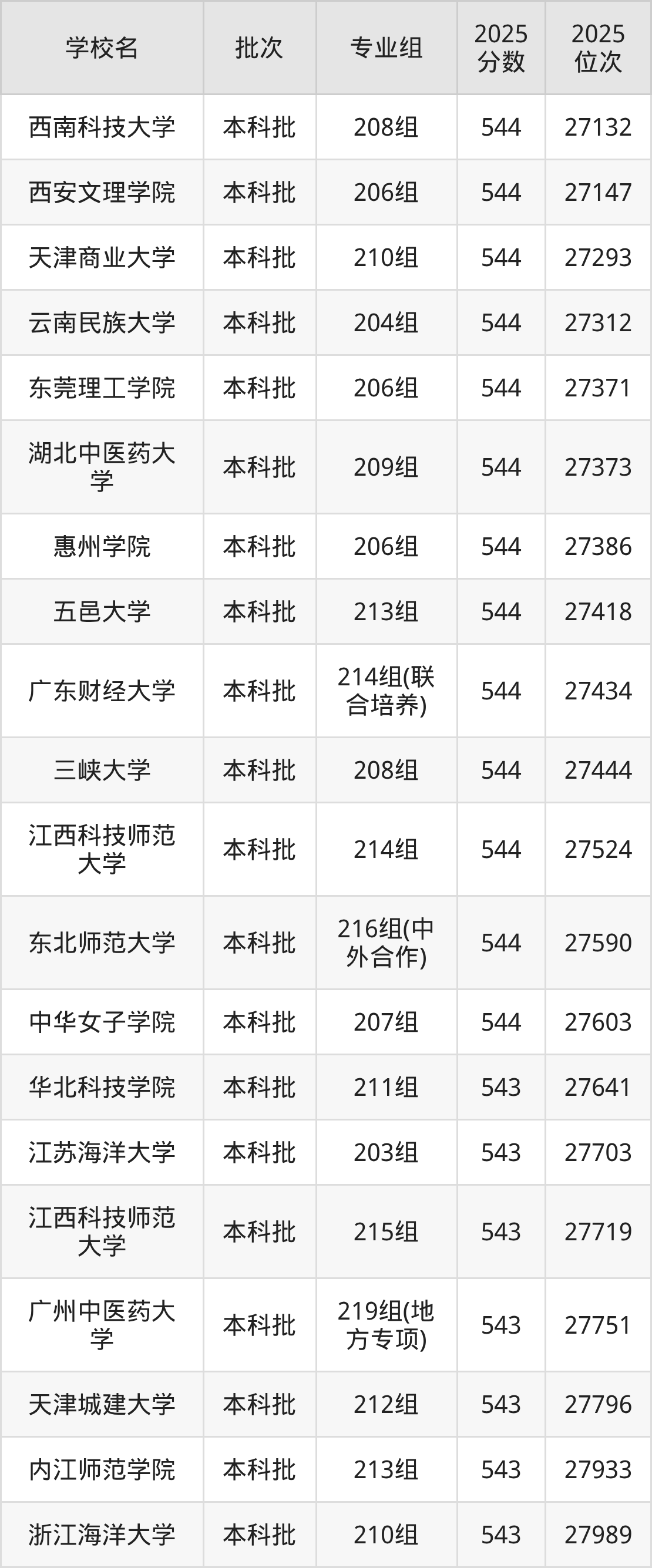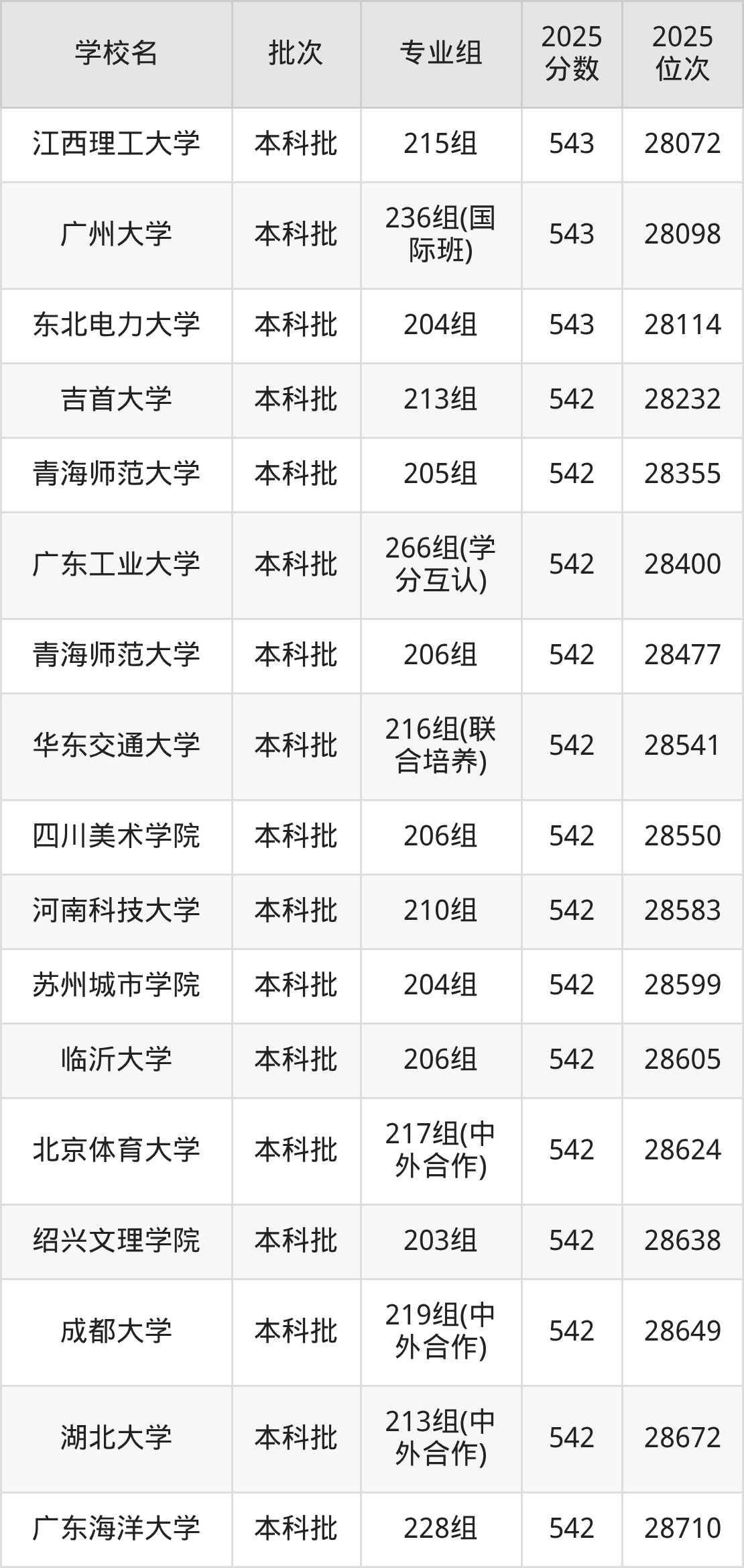 2025年广东高考历史类543分(27623名~28222名)能上的大学有东北电力大学204组、浙江海洋大学210组、江西理工大学215组、广州中医药大学219组(地方专项)等。