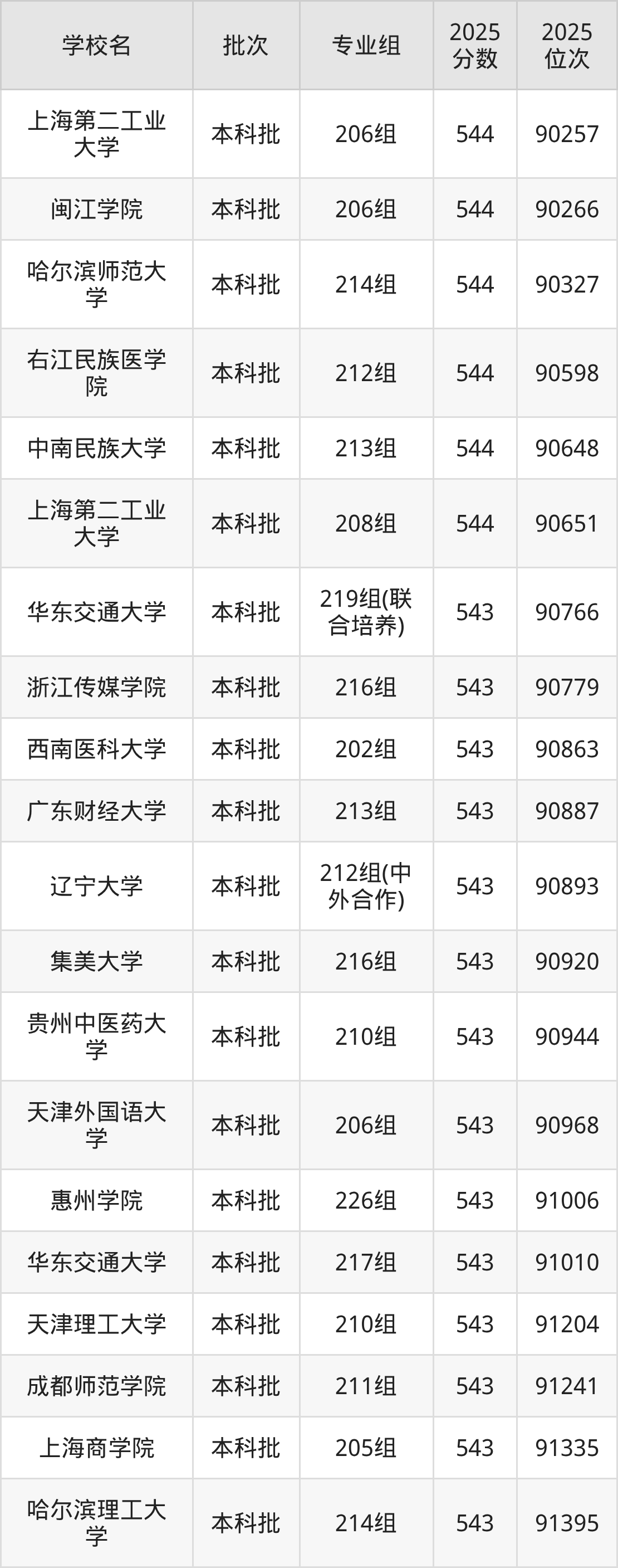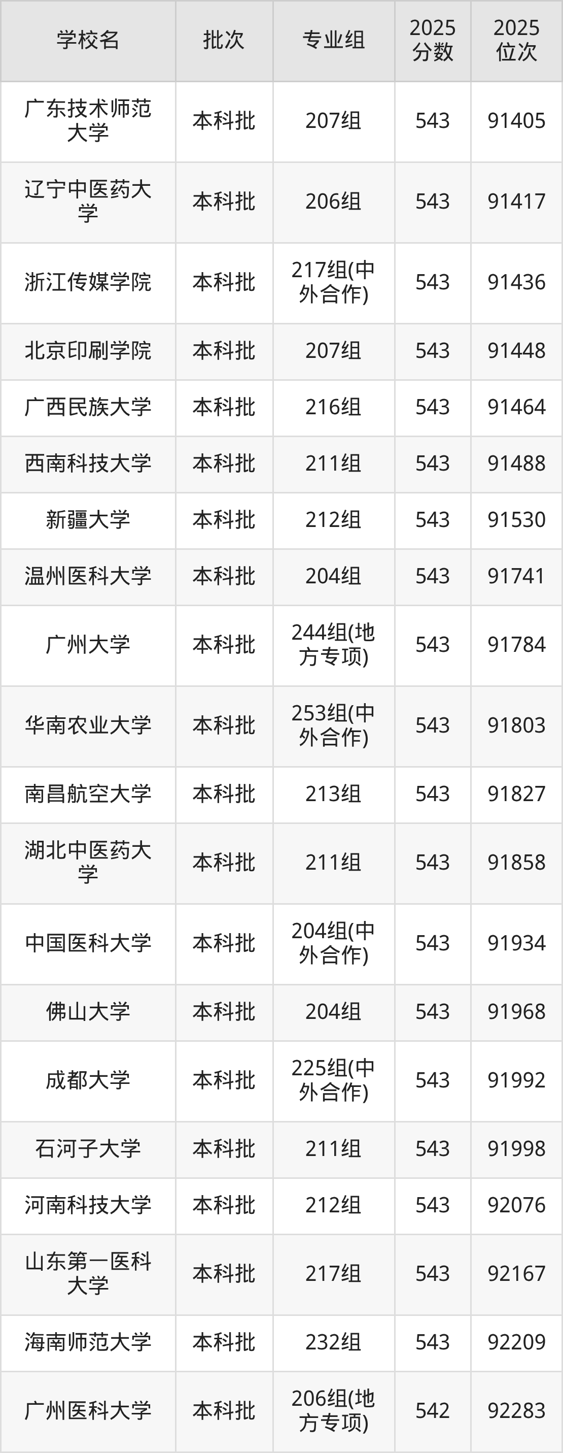2025年广东高考物理类543分(90714名~92214名)能上的大学有北京印刷学院207组、天津理工大学210组、天津外国语大学206组、辽宁大学212组(中外合作)等。