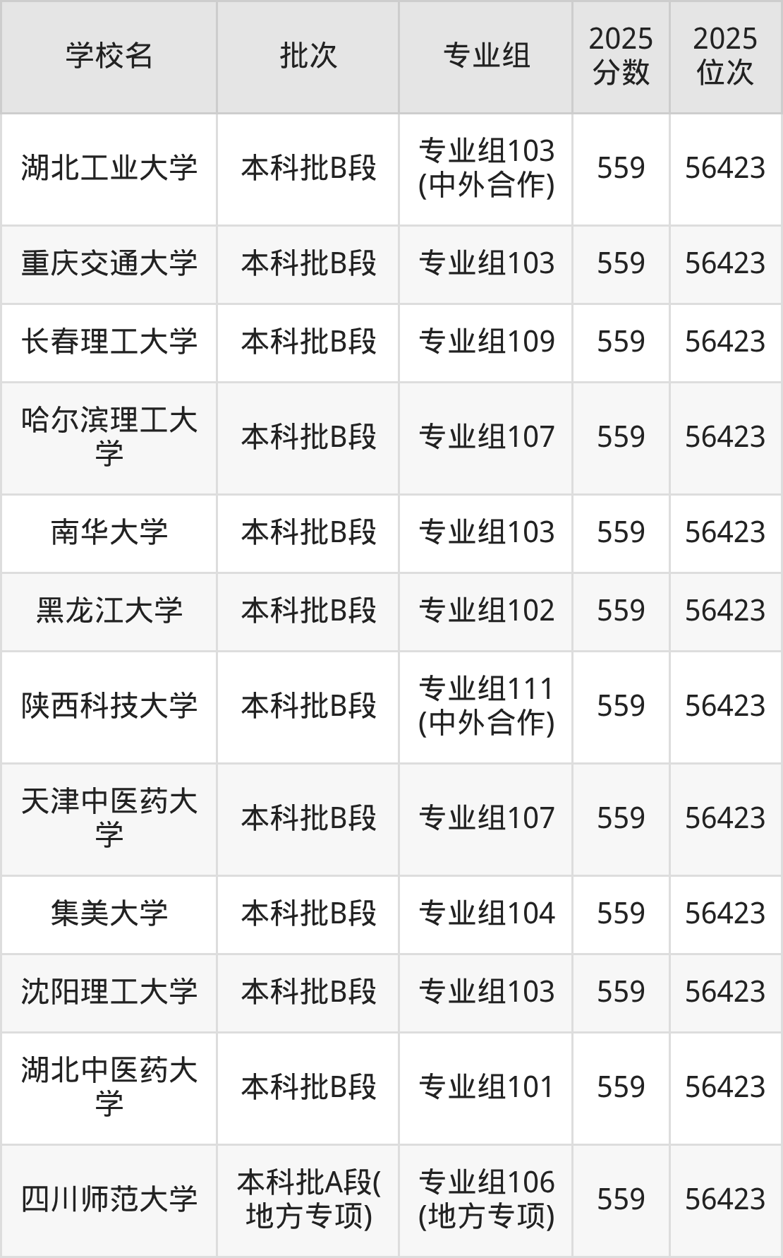 2025年四川高考物理类559分(55396名~56423名)能上的大学有陕西科技大学专业组111(中外合作)、中国人民警察大学专业组102、浙江师范大学专业组103、兰州交通大学专业组102等。