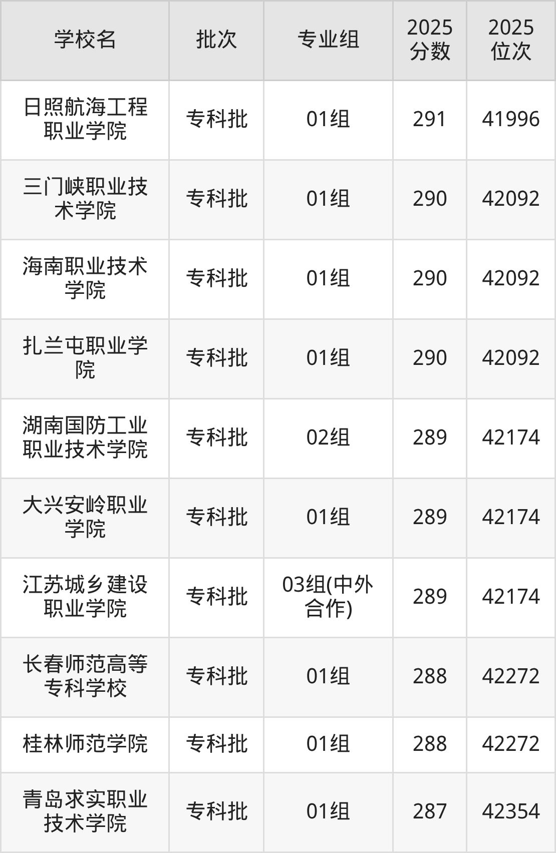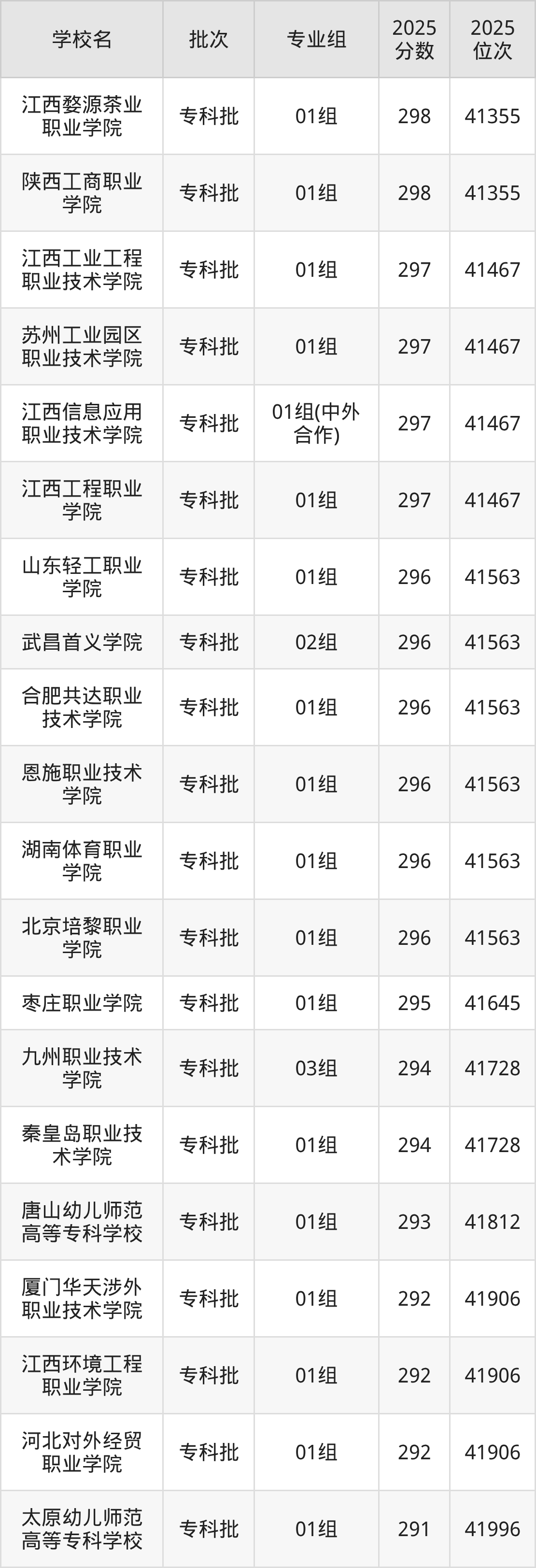2025年江苏高考历史类292分(41813名~41906名)能上的大学有江西环境工程职业学院01组、河北对外经贸职业学院01组、厦门华天涉外职业技术学院01组。