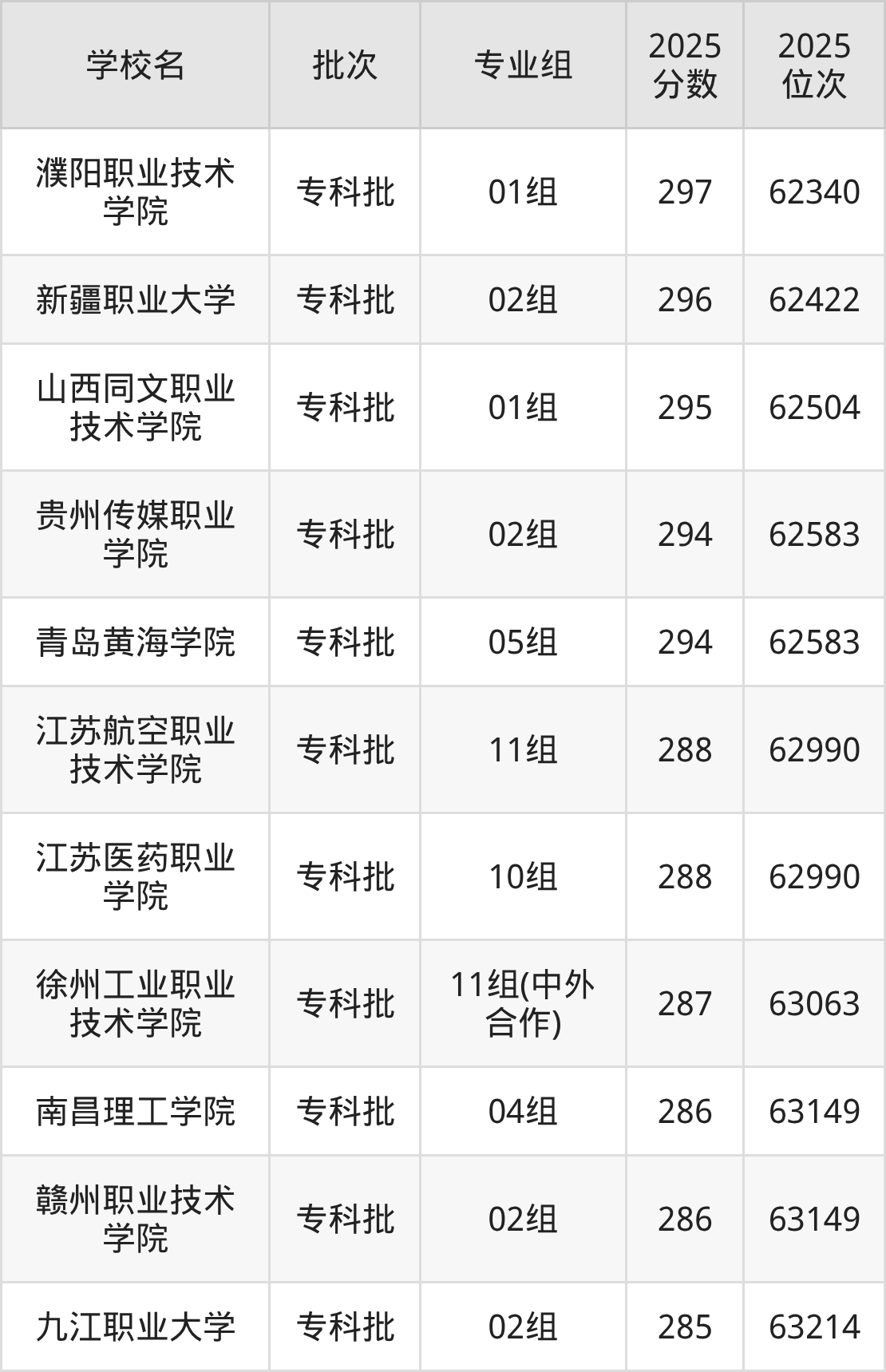 2025年江苏高考物理类292分(62638名~62714名)录取位次低于该区间(较稳妥)的有江苏航空职业技术学院11组(62990名)、江苏医药职业学院10组(62990名)等;录取位次高于该区间(可冲)的有贵州传媒职业学院02组(62583名)、青岛黄海学院05组(62583名)等。