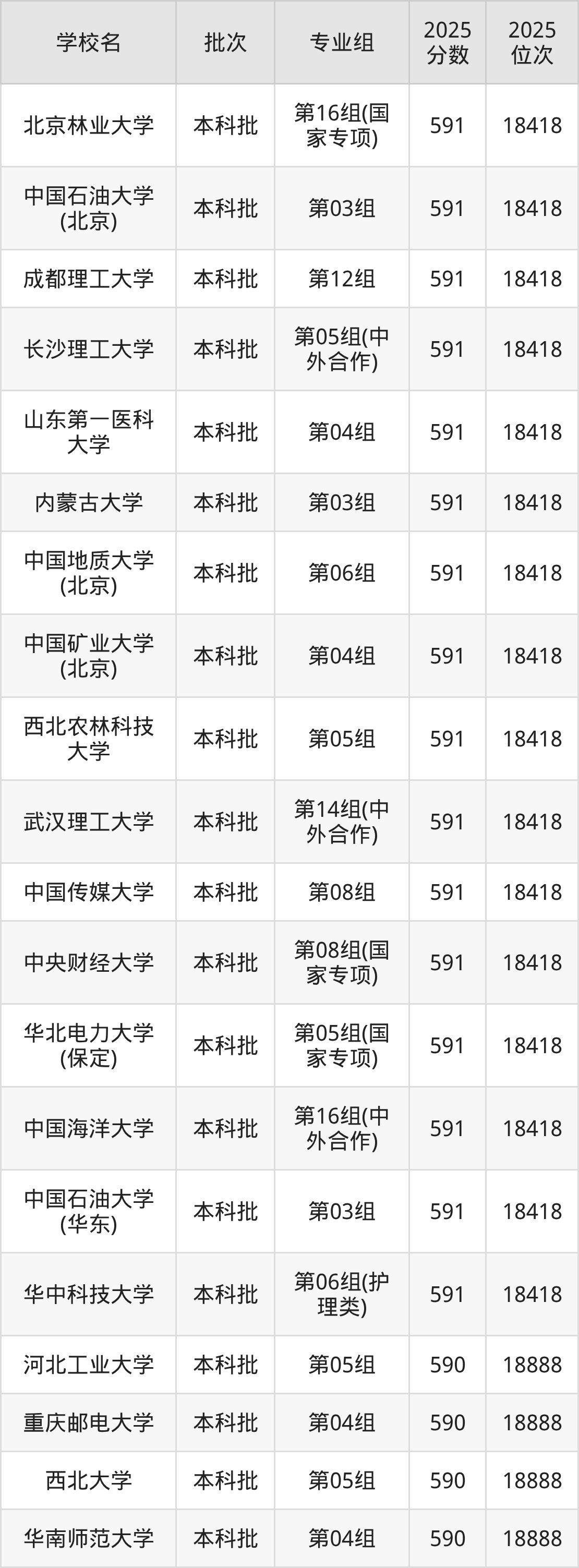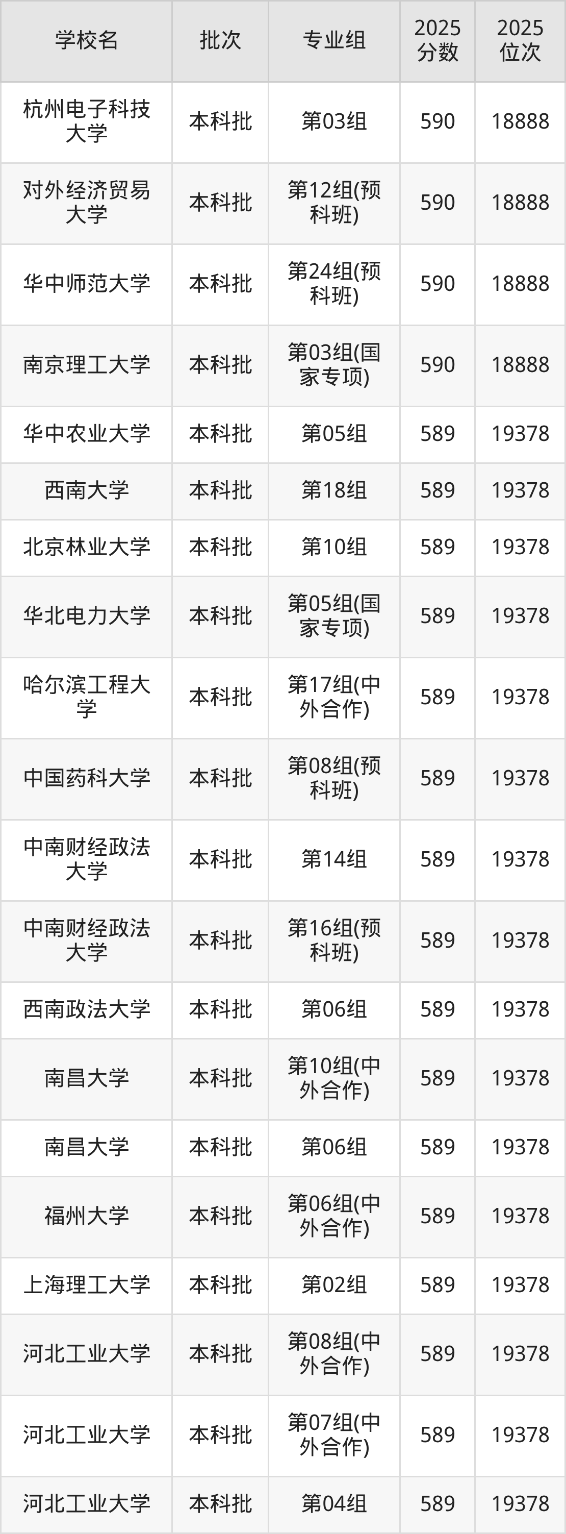 2025年湖北高考物理类589分(18889名~19378名)能上的大学有北京林业大学第10组、华北电力大学第05组(国家专项)、哈尔滨工程大学第17组(中外合作)、中国药科大学第08组(预科班)等。