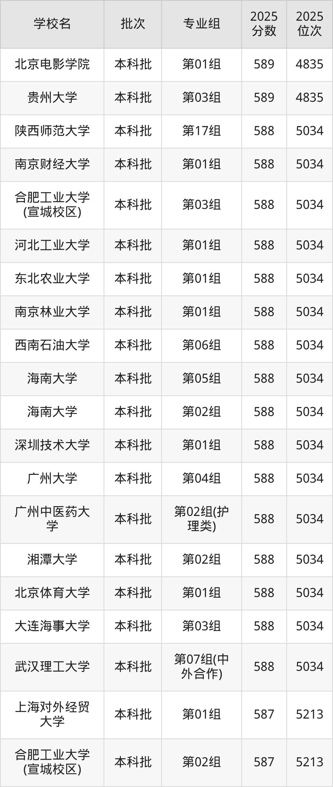 2025年湖北高考历史类589分(4676名~4835名)能上的大学有西南大学第14组、首都经济贸易大学第01组、北京电影学院第01组、上海海事大学第02组等。