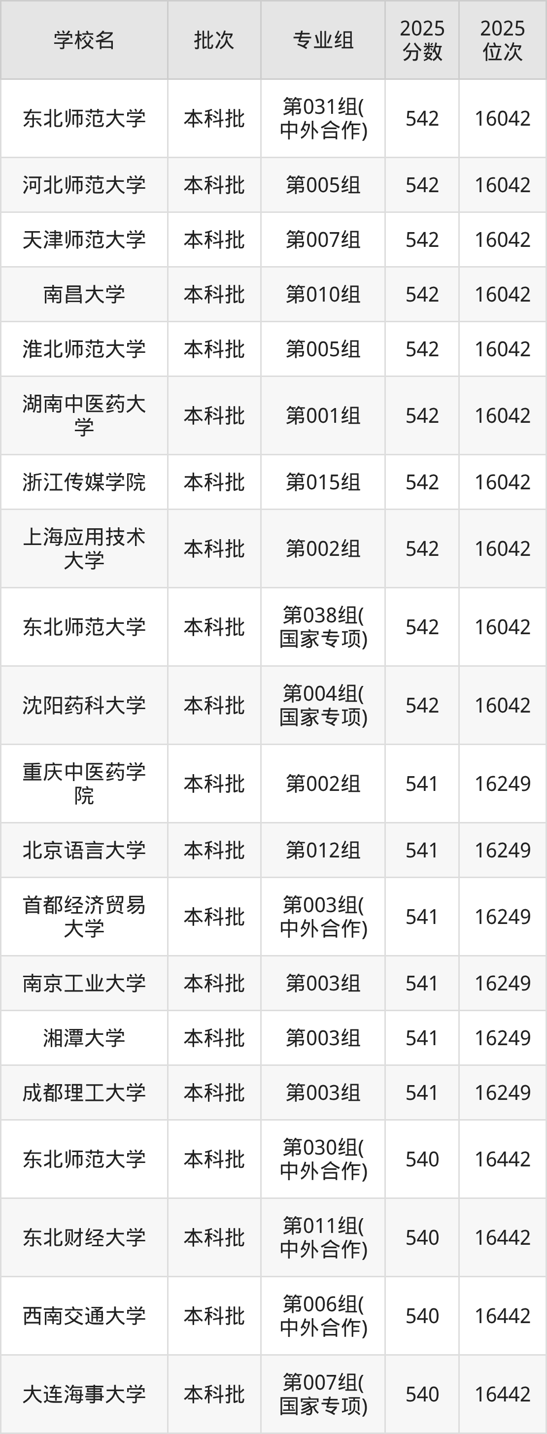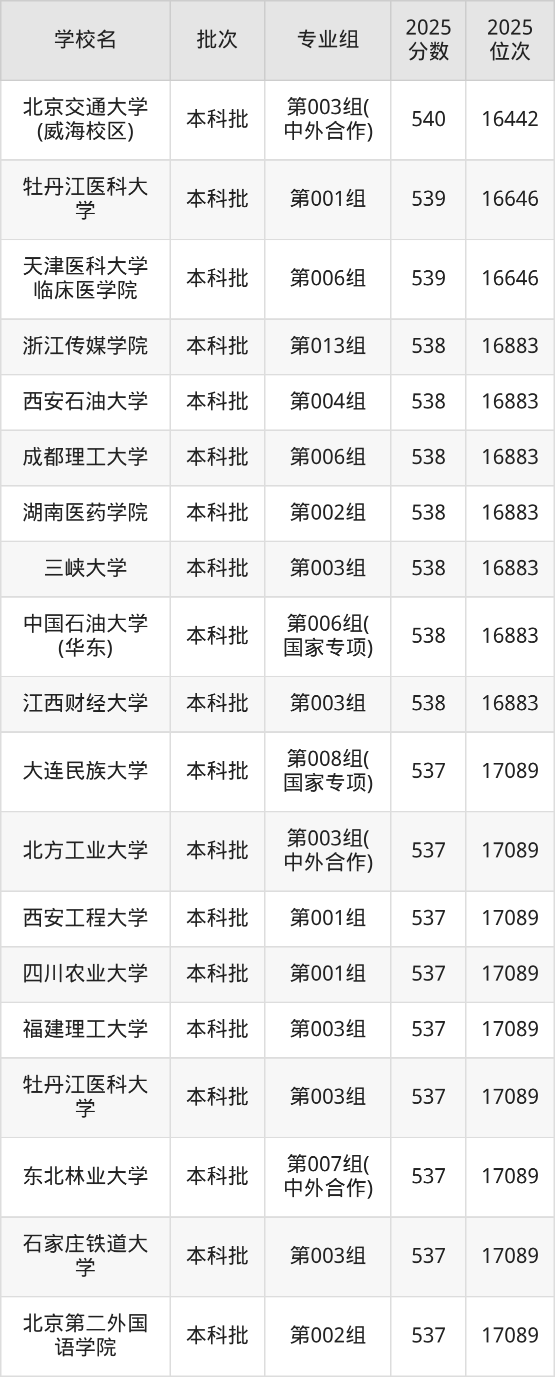 2025年吉林高考物理类539分(16443名~16646名)能上的大学有天津医科大学临床医学院第006组、牡丹江医科大学第001组。