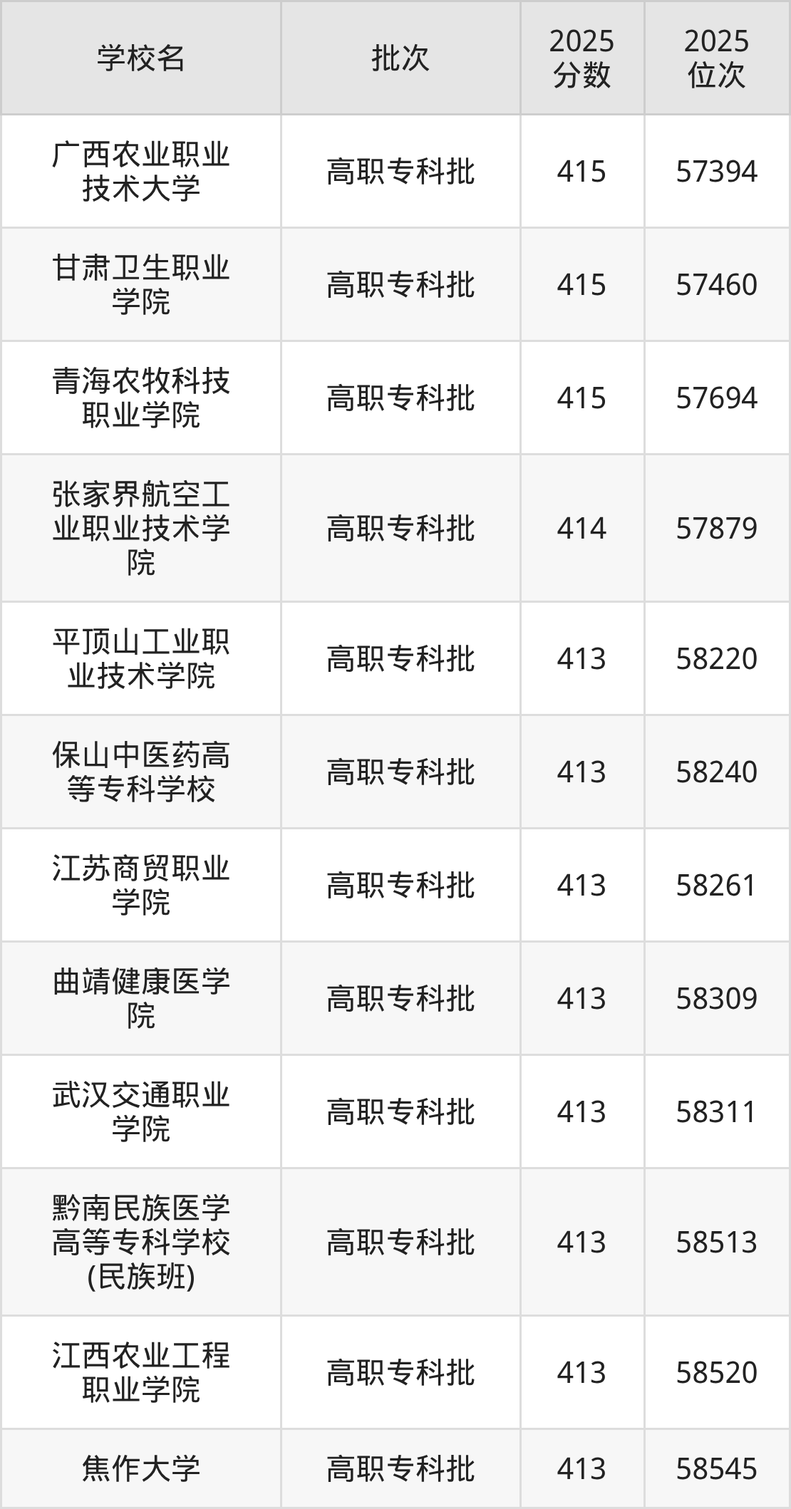 另外录取位次低于该区间(较稳妥)的有平顶山工业职业技术学院(58220名)、保山中医药高等专科学校(58240名)等;录取位次高于该区间(可冲)的有青海农牧科技职业学院(57694名)、甘肃卫生职业学院(57460名)等。