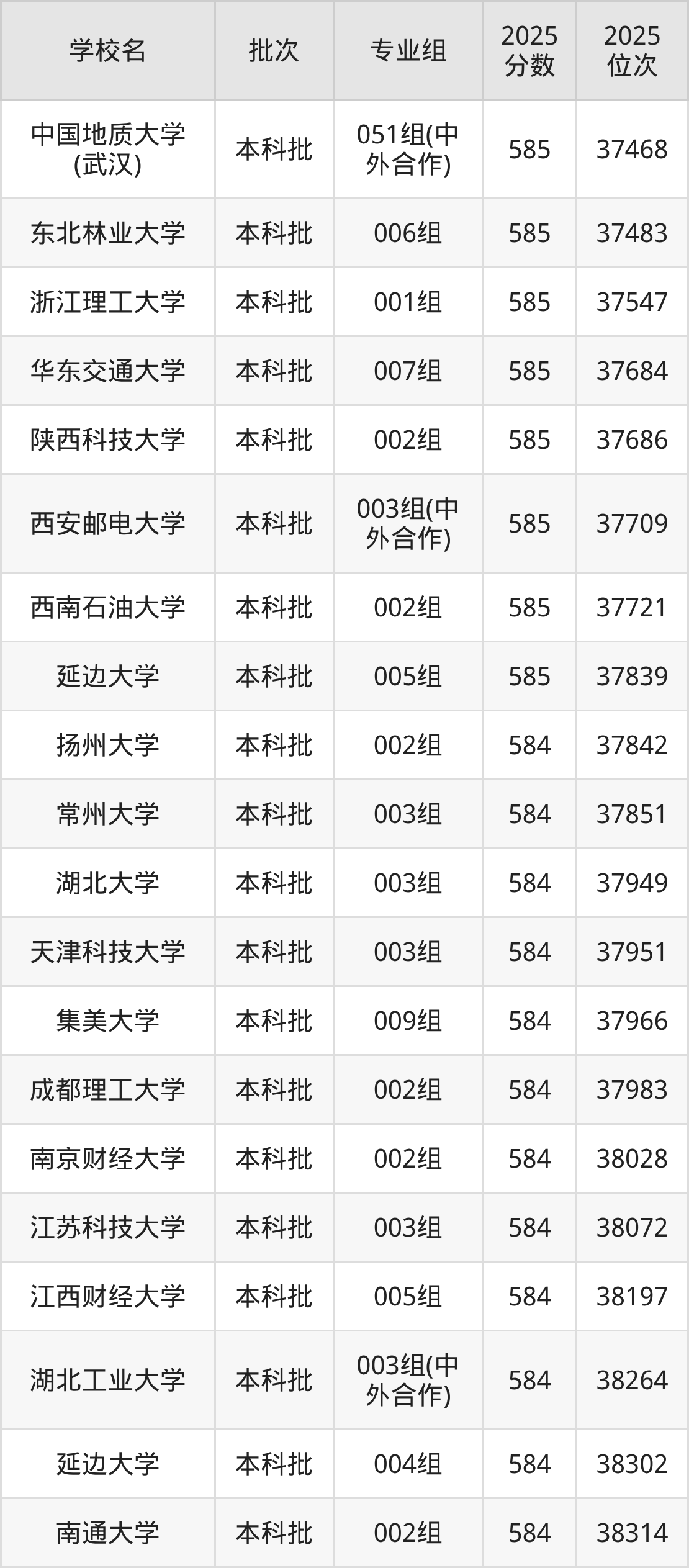 2025年安徽高考物理类584分(37840名~38612名)能上的大学有常州大学003组、成都理工大学002组、贵州大学002组、湖北大学003组等。
