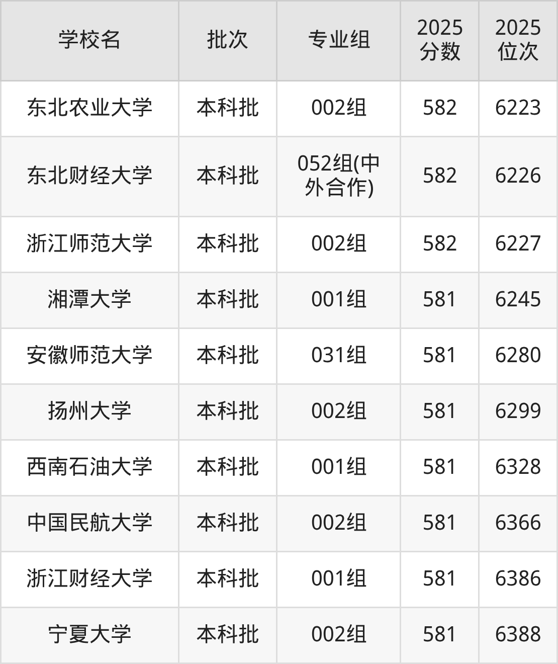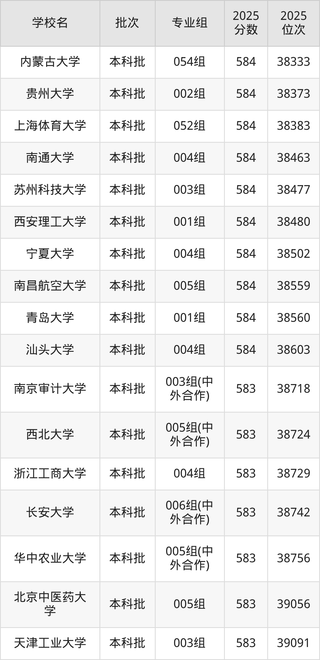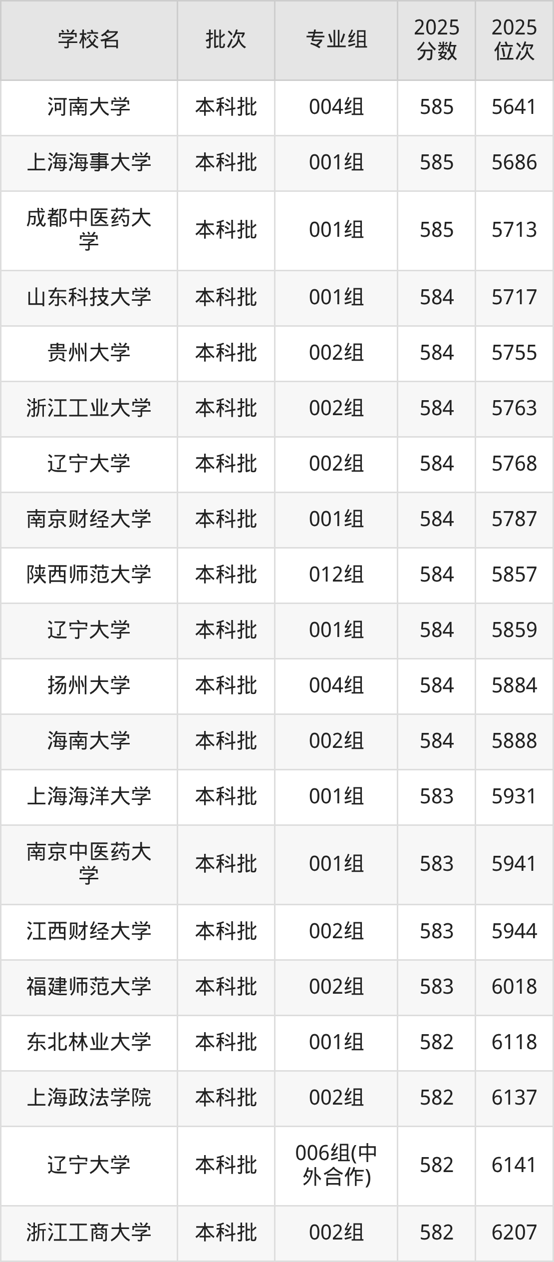 2025年安徽高考历史类584分(5714名~5893名)能上的大学有贵州大学002组、海南大学002组、辽宁大学001组、辽宁大学002组等。