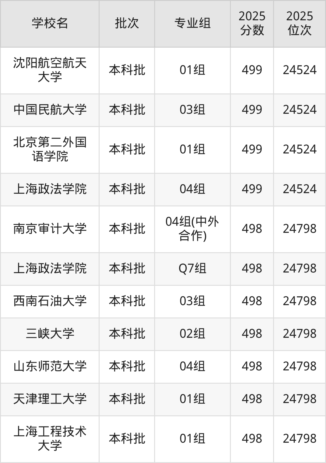 2025年上海高考499分(24252名~24524名)能上的大学有上海政法学院04组、北京第二外国语学院01组、中国民航大学03组、沈阳航空航天大学01组等。