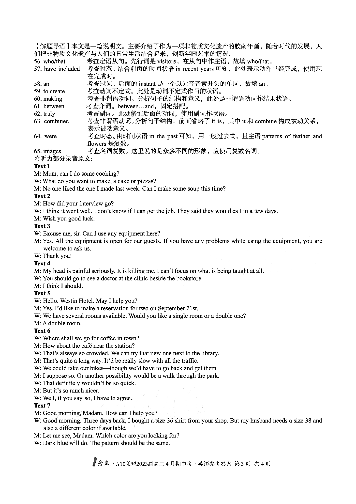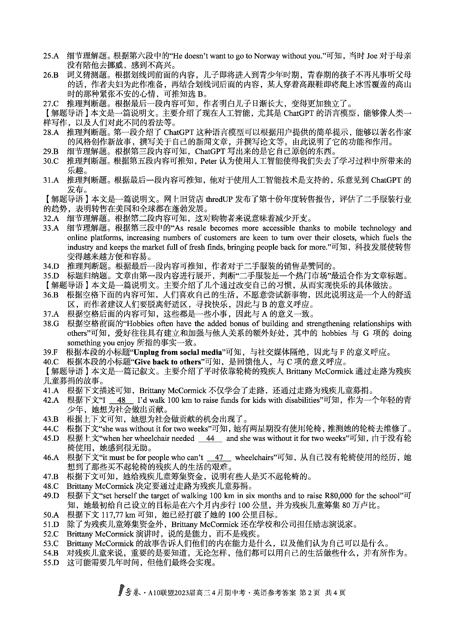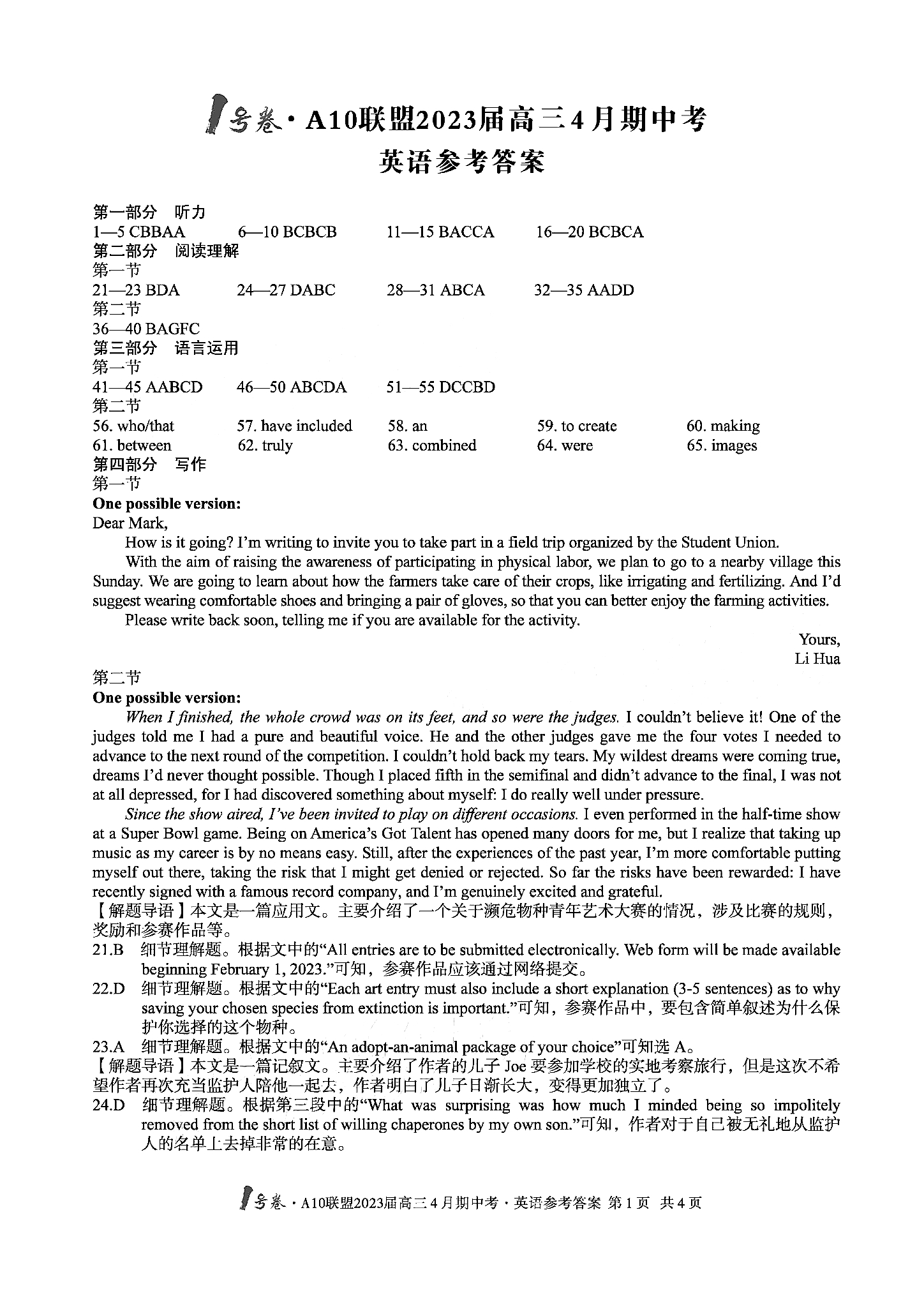 二、2023安徽A10联盟高三4月期中考试英语答案解析