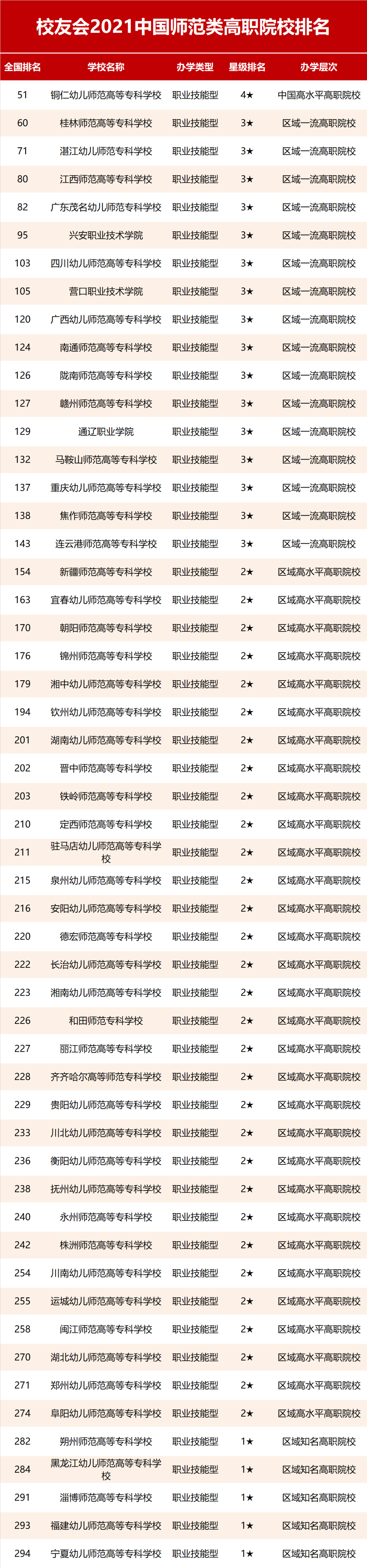 不仅如此,我国还有60余所高职师范院校,不过高职院校的办学类型与独立学院的应用型不一样,高职师范类院校的人才培养方向,更倾向于培养职业技能。在高职师范类院校中,铜仁幼儿师范高等专科学校、桂林师范高等专科学校、湛江幼儿师范专科学校分别位列前三。
