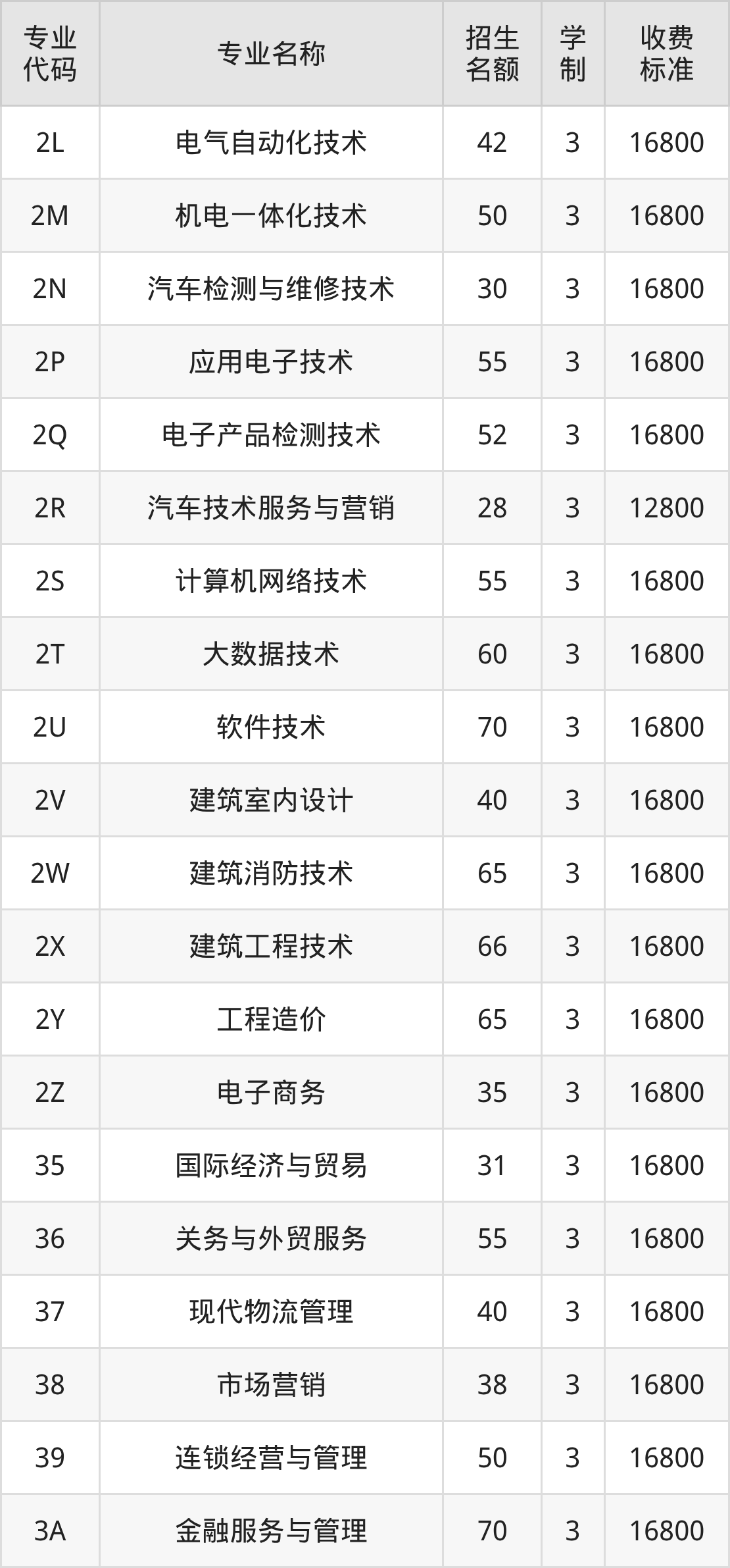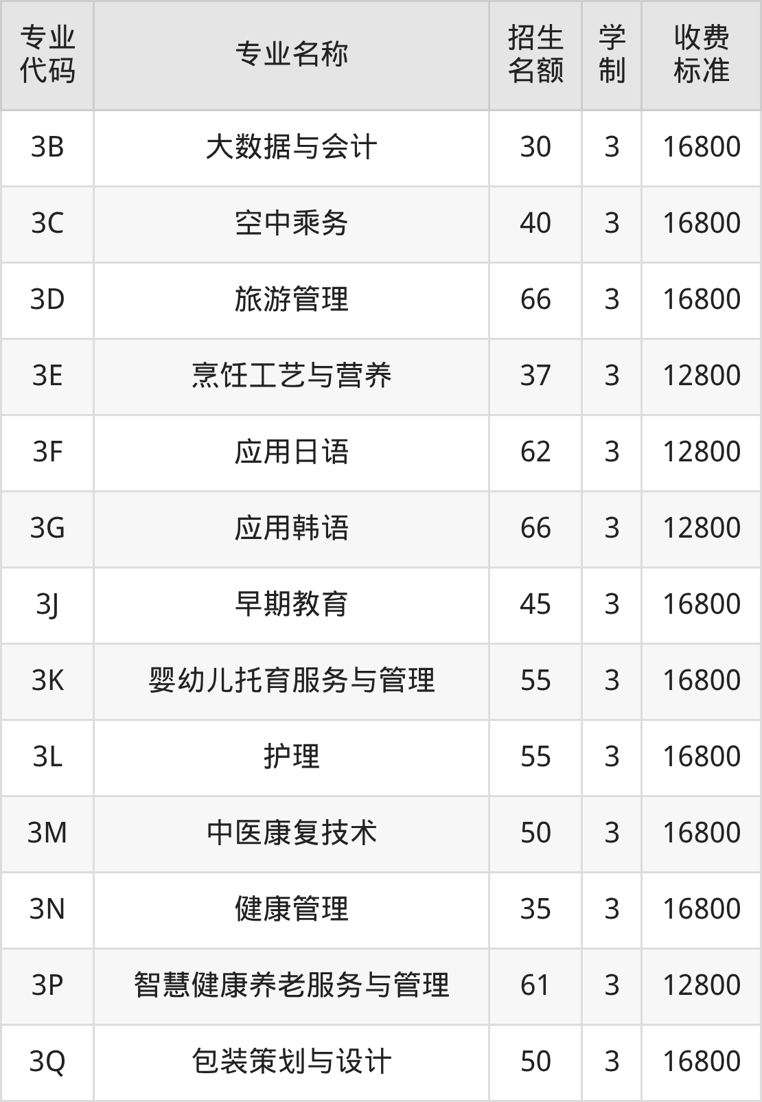 | 专业 代码 | 专业名称 | 招生 名额 | 学 制 | 收费 标准 |