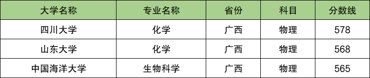 2024年广西壮族自治区入围分数在570分左右的强基大学共有3所,其中中国海洋大学对应招生专业为生物科学,对应最低入围分数为565分。