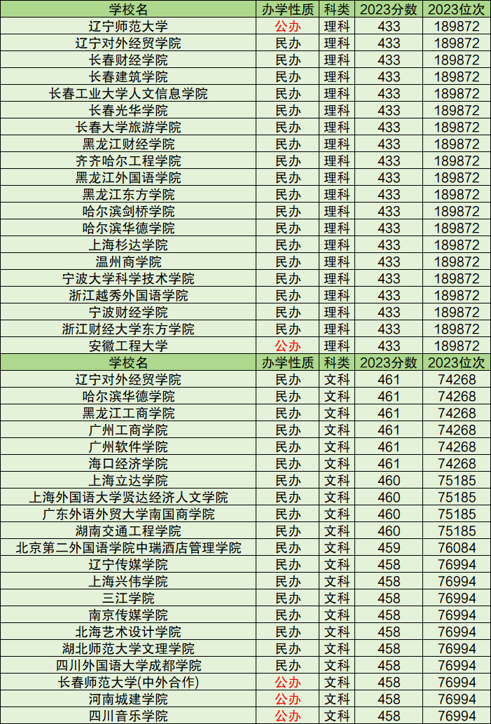2023年该省理科本科二批分数线是409分,压线录取的大学有6所,公办只有南阳师范学院这一所,不过最低分专业仍然是较高收费的。民办性质的高校中,比较好的有北京第二外国语学院中瑞酒店管理学院和首都师范大学科德学院,压线生可报考。