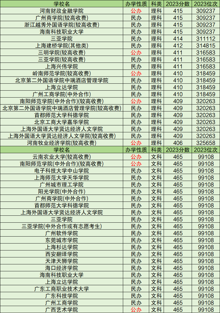 2023年该省文科本科二批分数线是465分,压线录取的大学有23所,其中公办性质的有云南农业大学、南阳师范学院和广西艺术学院,其中两所都具有保研资格,不过前两所收分最低的是较高收费的专业。另外收分较低的好大学还有广东科技学院、三亚学院、电子科技大学中山学院等。