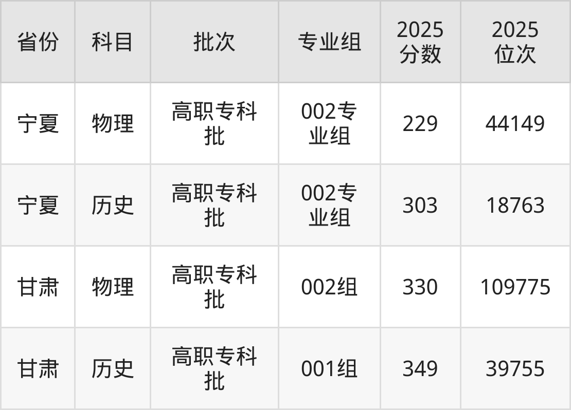 2025年宁夏民族职业技术学院在各省普通批录取分数线一览表: