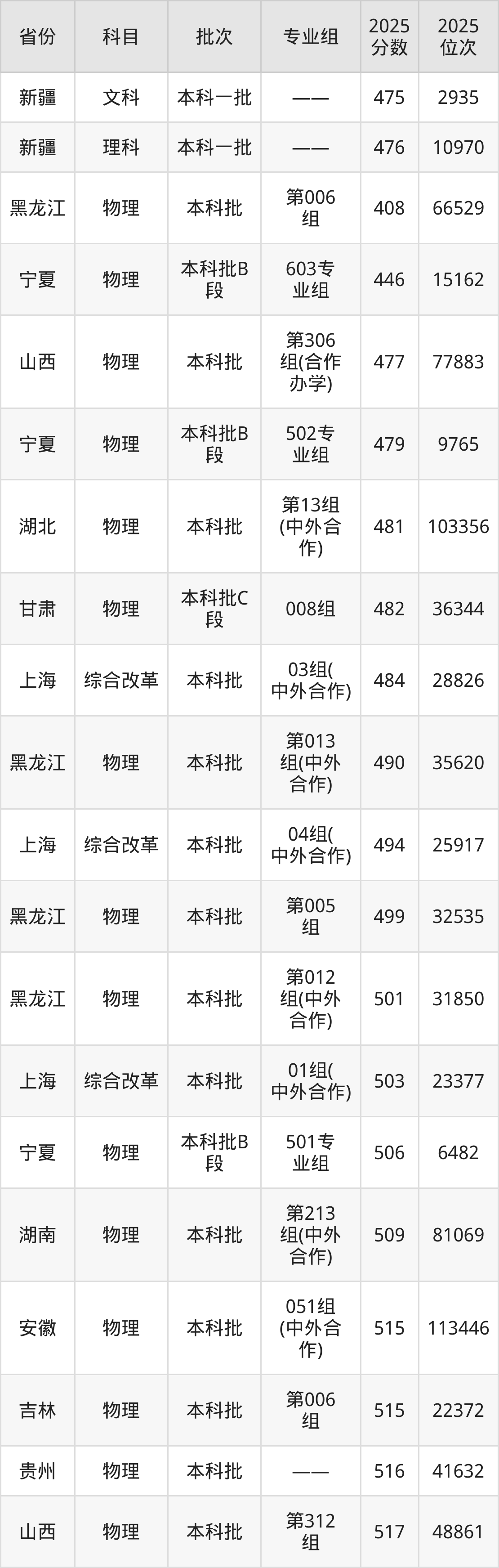 最低录取分数线是475分,对应位次是2935名,招生地区为新疆;