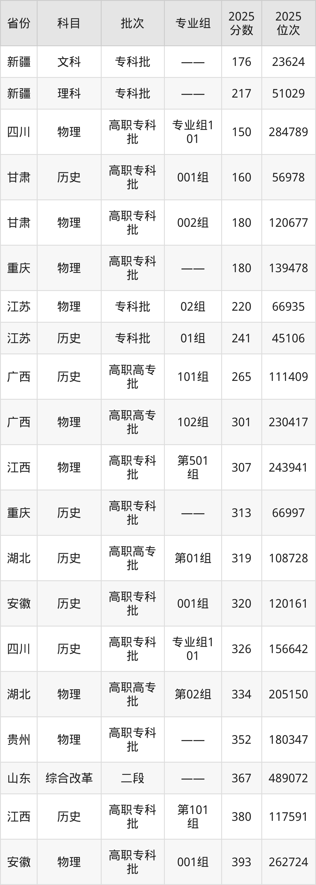 2025年武汉科技职业学院在各省物理类和理科的录取分数线位于150分-393分之间。