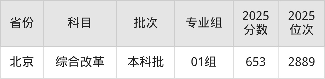 最高录取分数线是653分,对应位次是2889名,招生地区为北京。