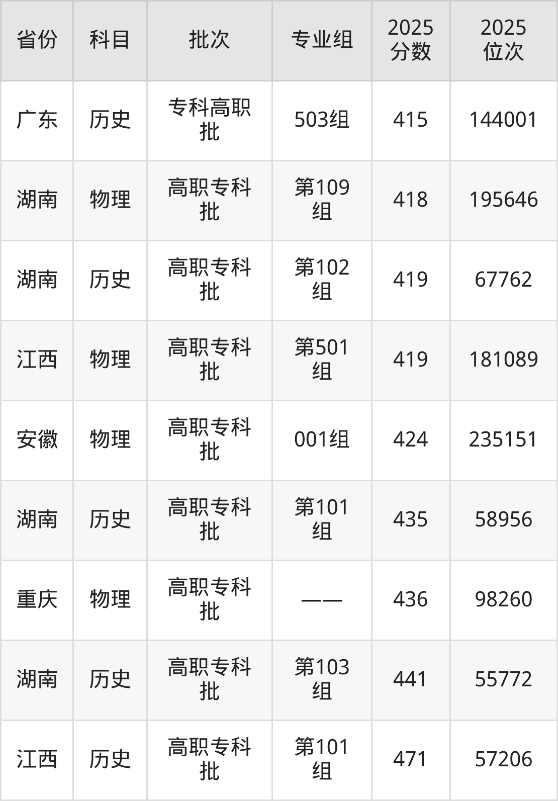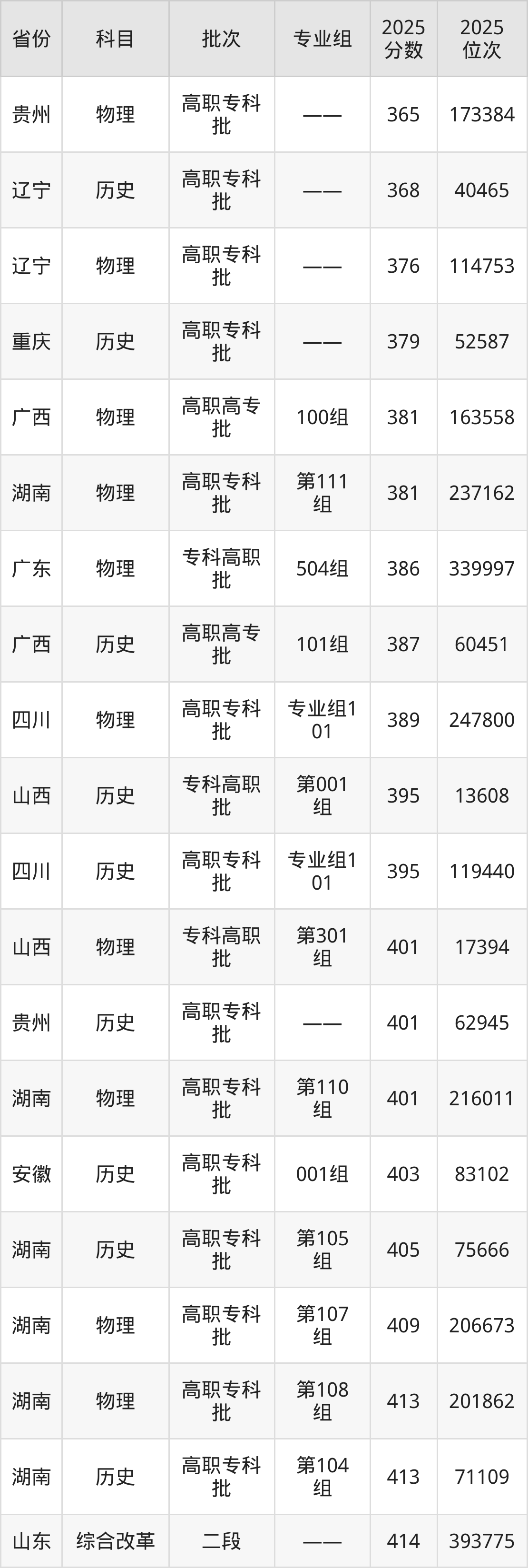 2025年湖南科技职业学院在普通批次招生,录取分数线是365分-471分。