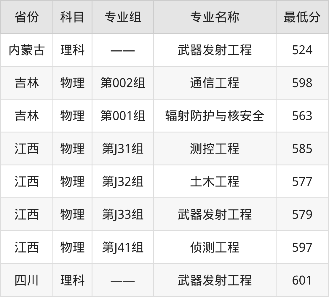 火箭军工程大学本科提前批各省具体录取分数线一览表:
