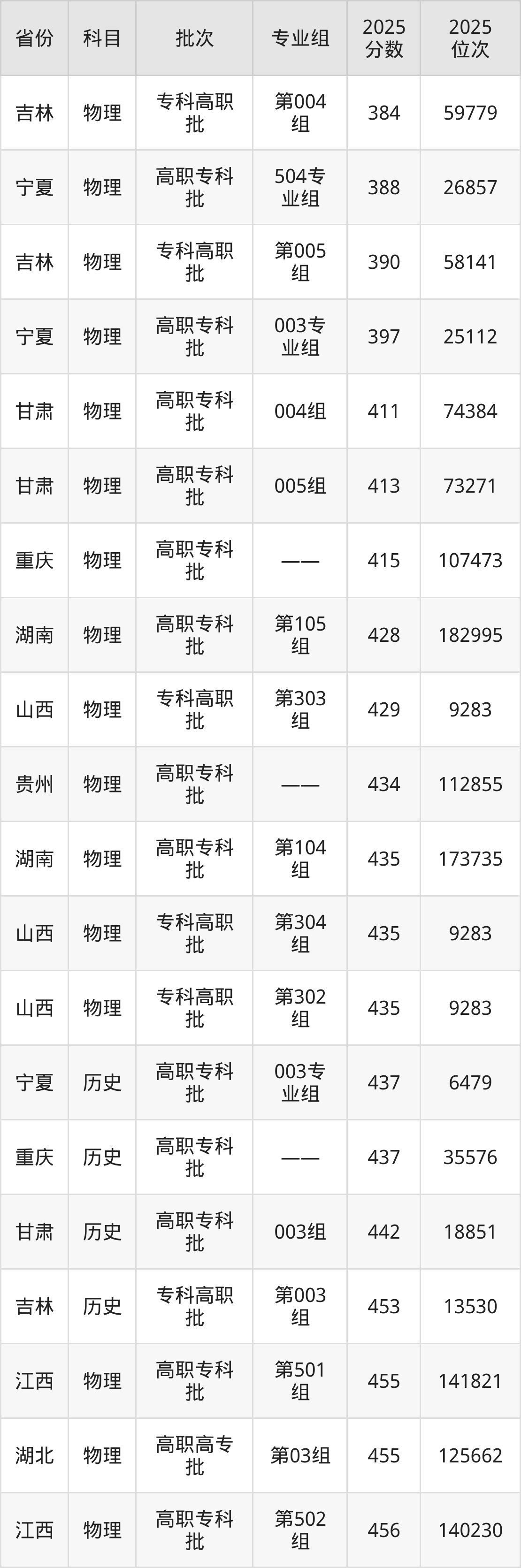 2025年重庆医药高等专科学校在各省物理类的录取分数线位于384分-494分之间。