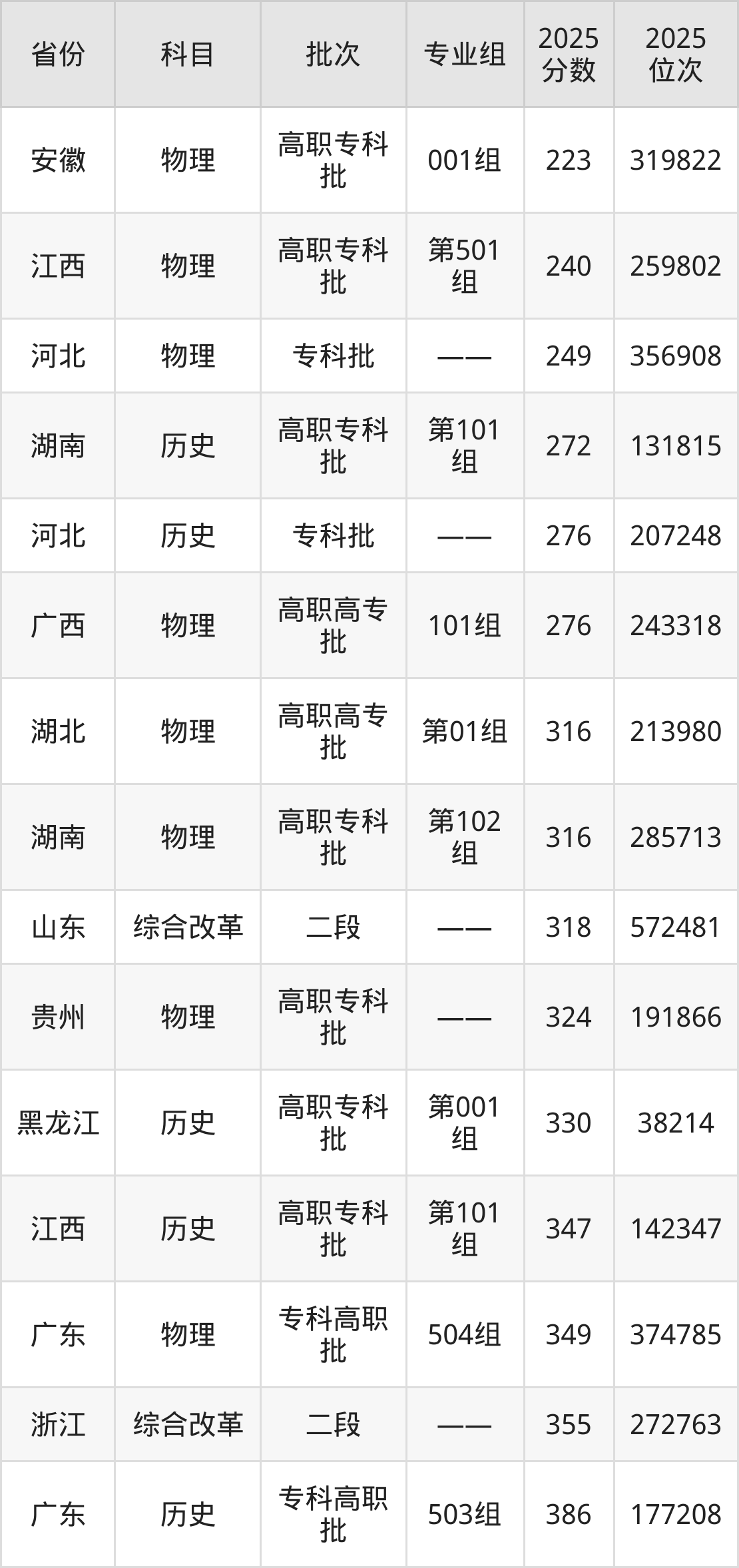 最低录取分数线是223分,对应位次是319822名,招生地区为安徽;