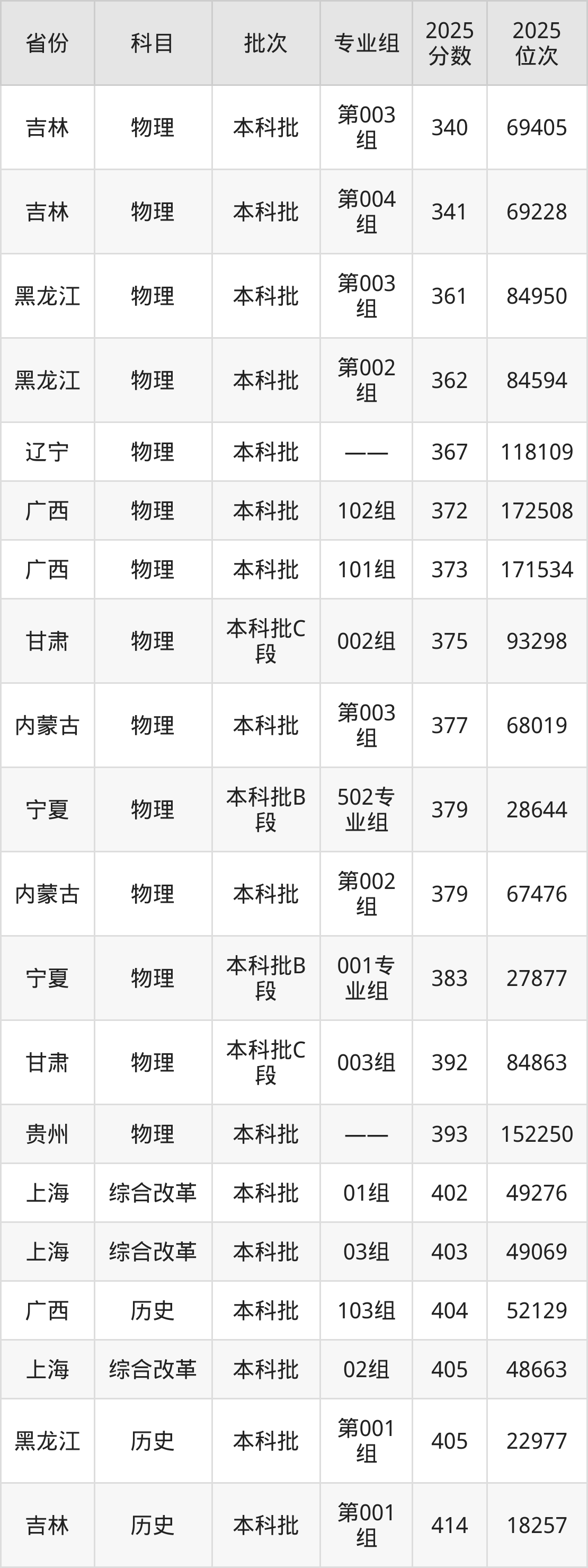 最低录取分数线是340分,对应位次是69405名,招生地区为吉林;
