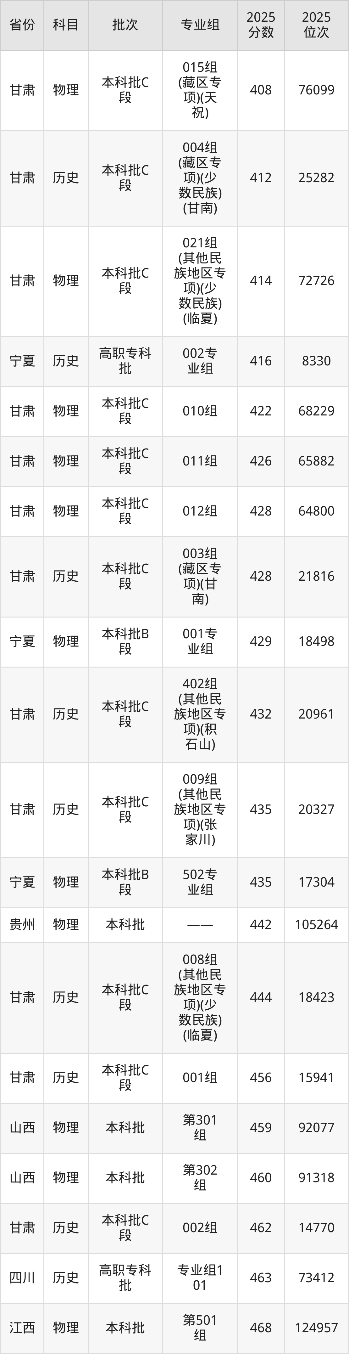2025年陇南师范学院在各省普通批录取分数线一览表: