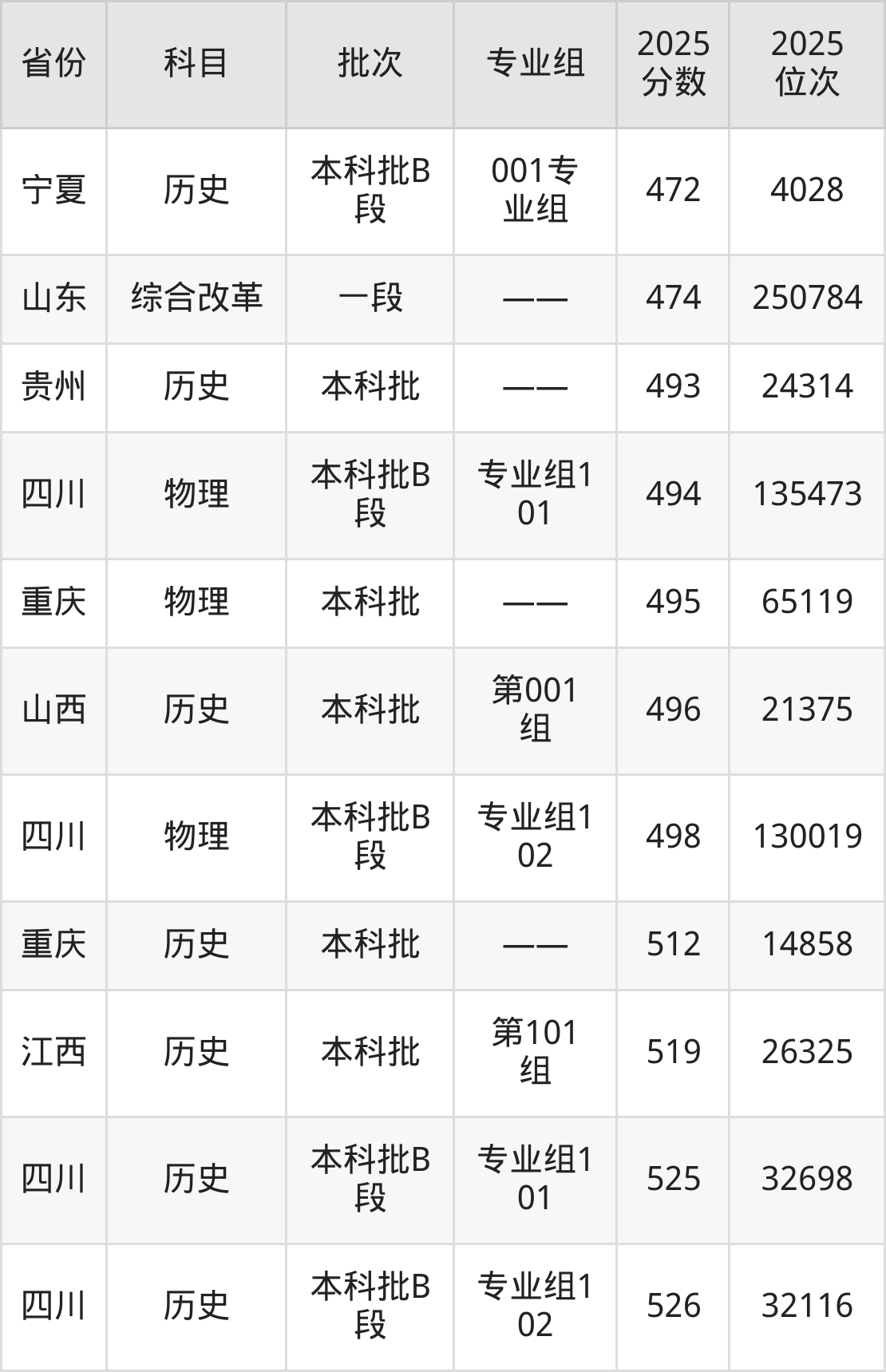 最高录取分数线是526分,对应位次是32116名,招生地区为四川。