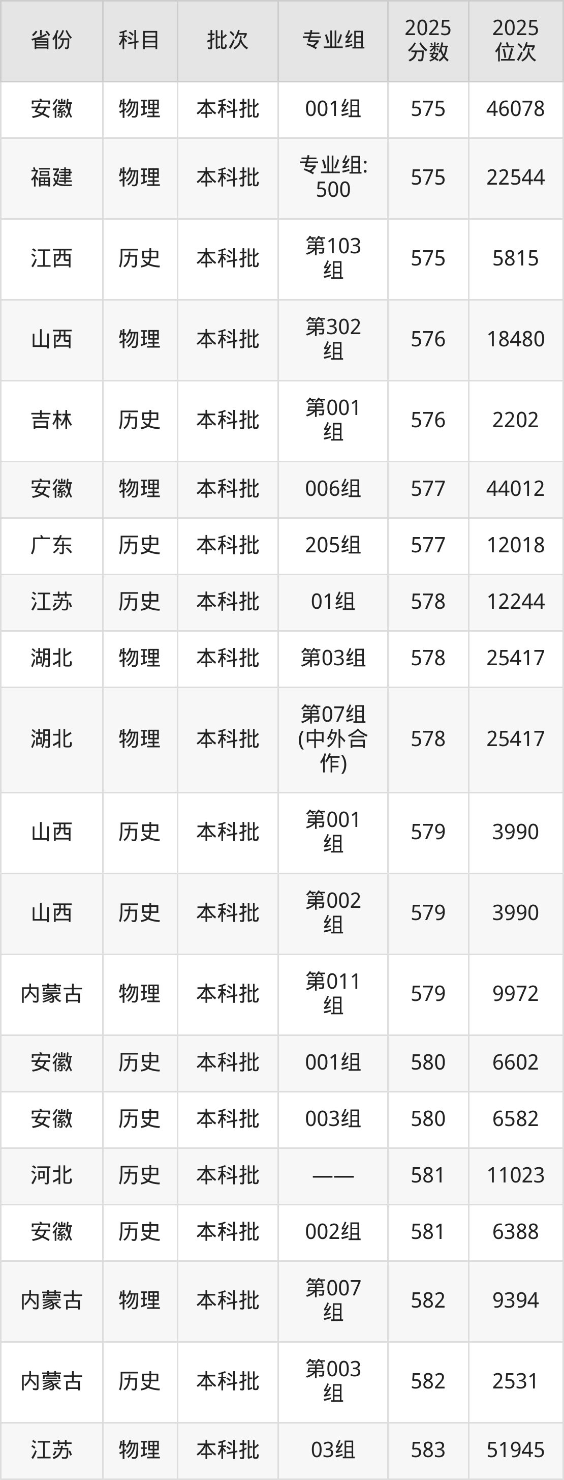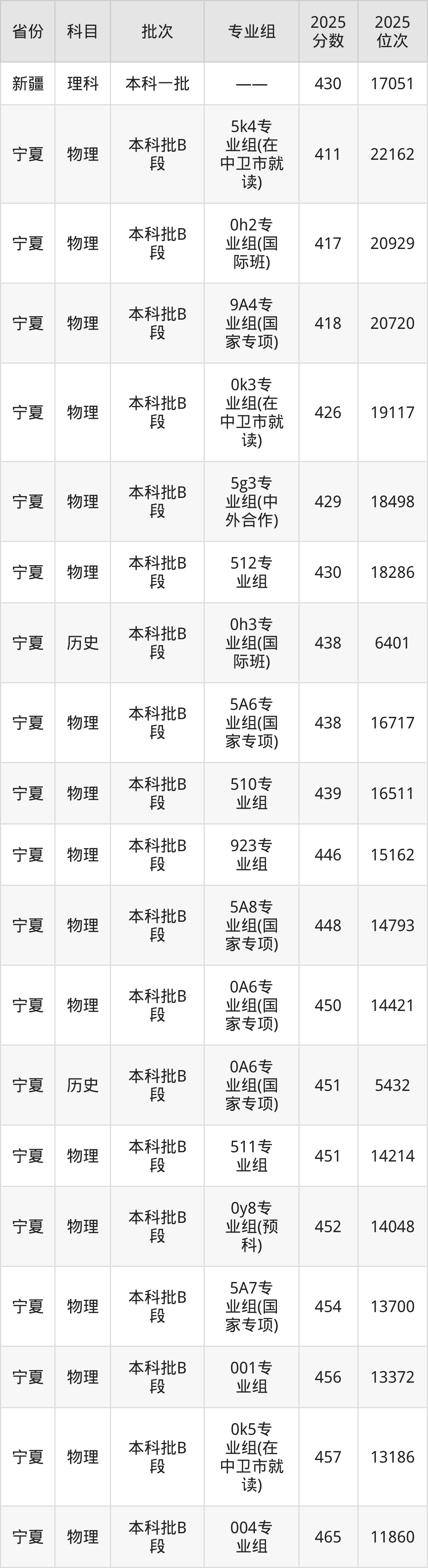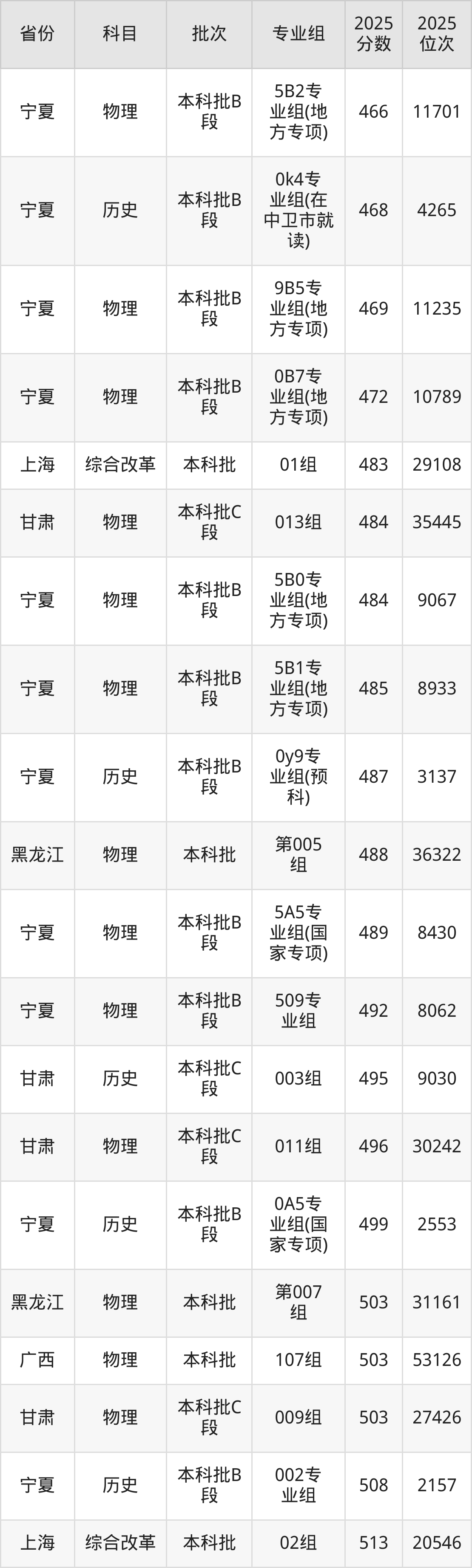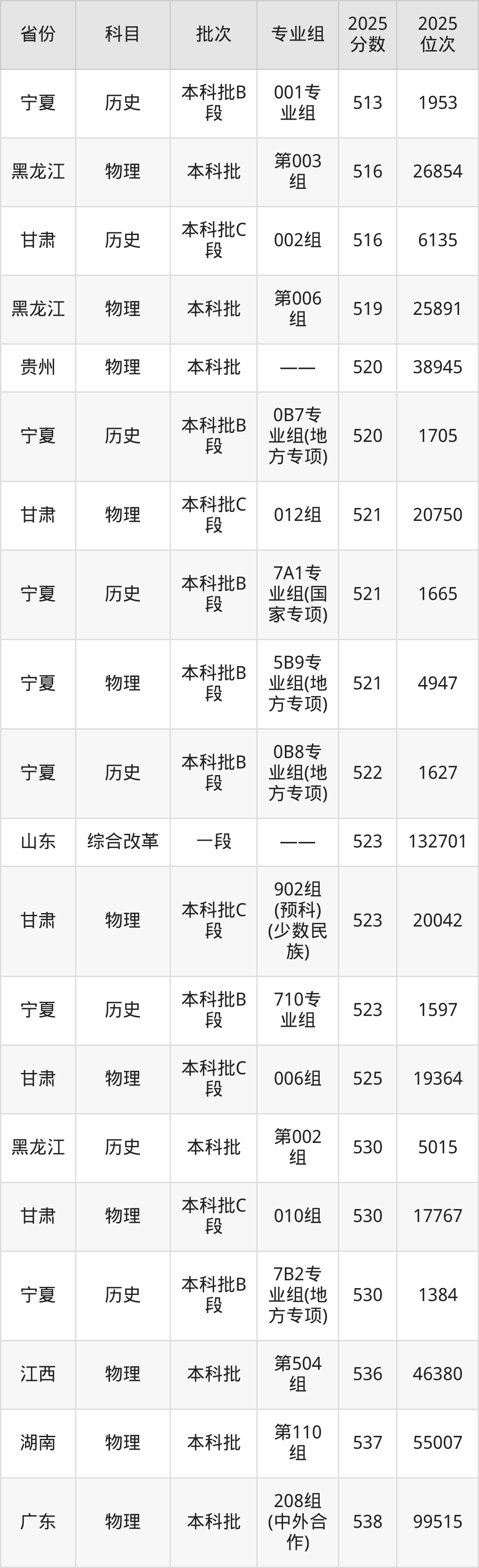 2025年宁夏大学在各省普通批录取分数线一览表: