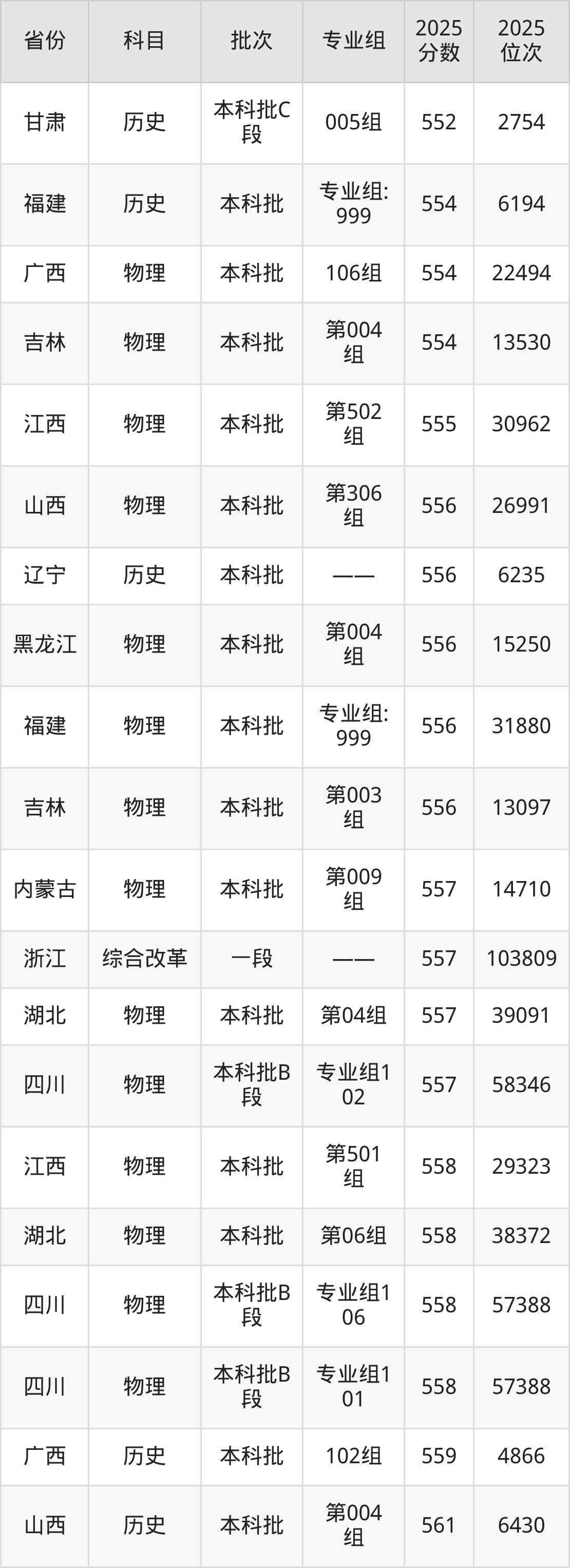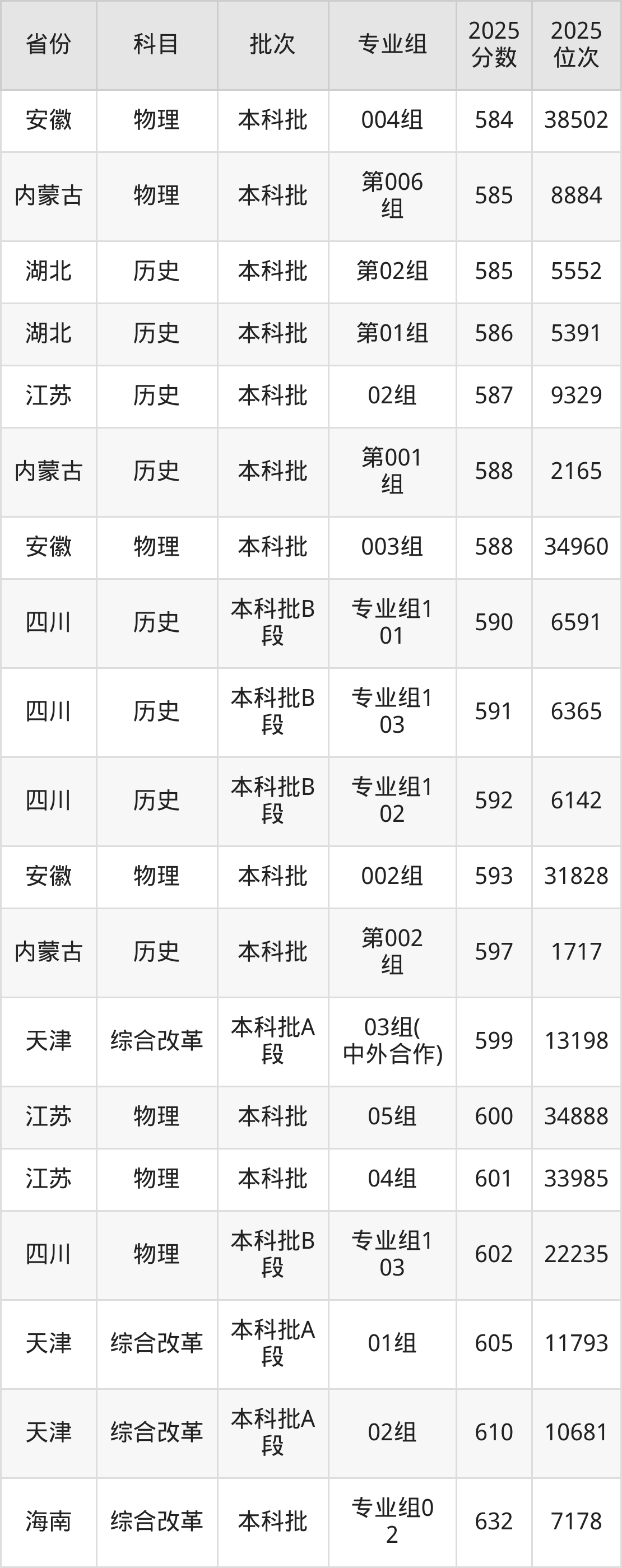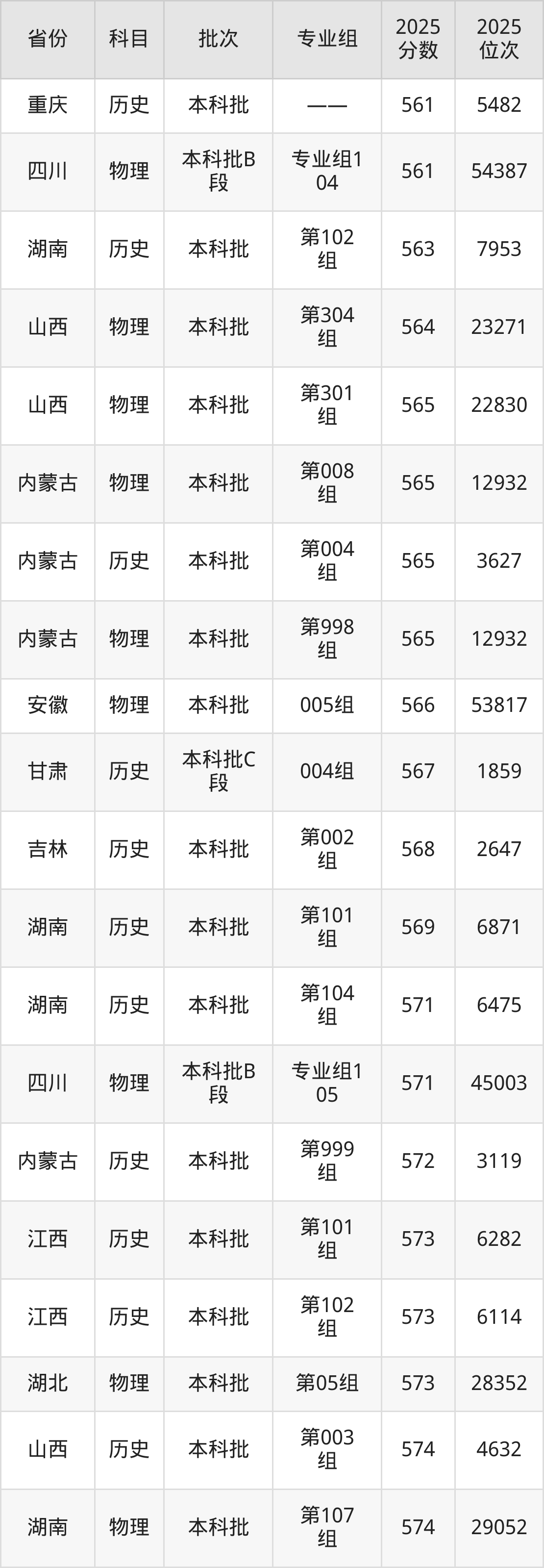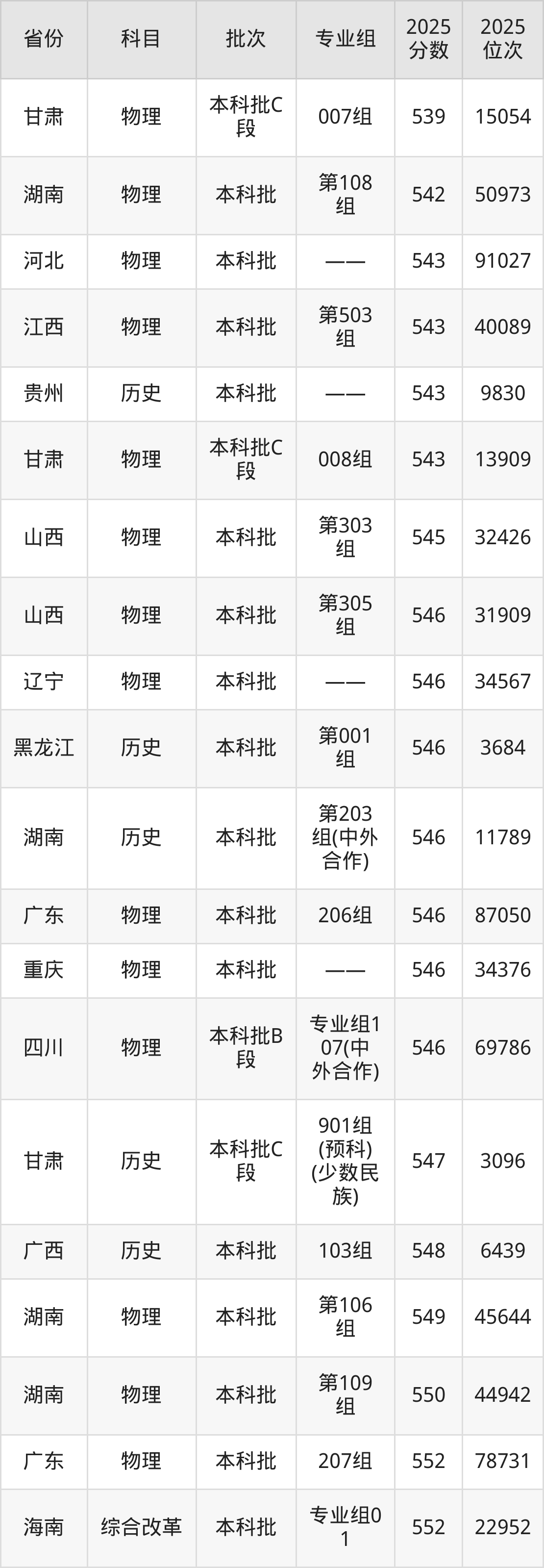 2025年宁夏大学在各省普通批录取分数线一览表: