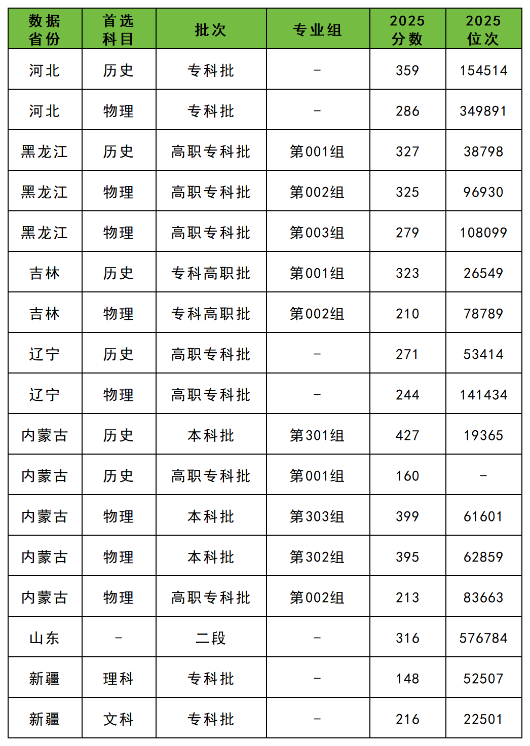 本科招生只在内蒙古内进行。2025年物理类最低395分,历史类最低427分。